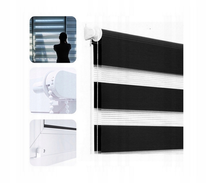 •  – izmenično tkana tkanina (77 mm) in prozorna mreža (50 mm). Komplet vključuje: Rolo zavesa DAN-NOČ