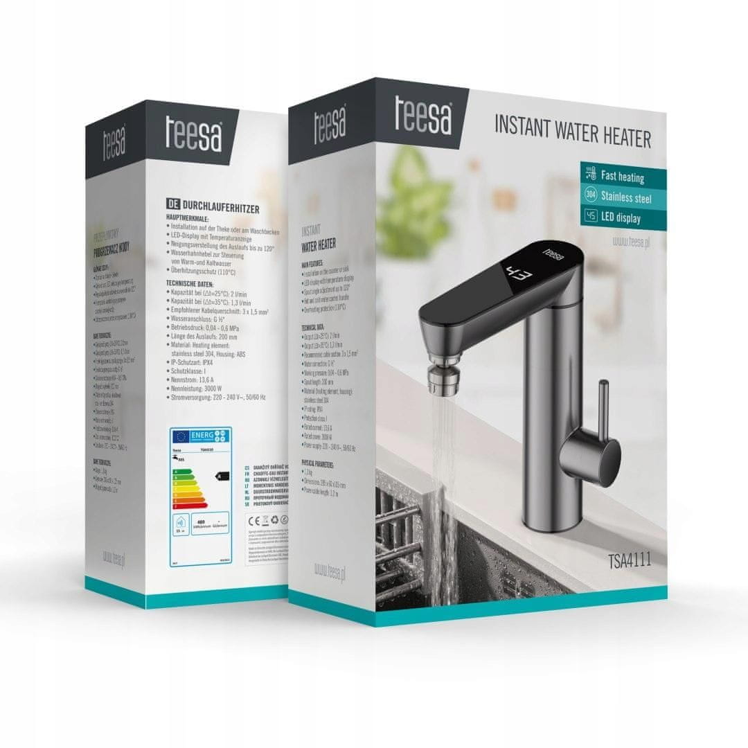 Kompaktni grelnik vode Teesa, ki se namesti neposredno na pult ali pomivalno korito, je praktična rešitev, ko potrebujete takojšnjo toplo vodo, brez čakanja ali uporabe bojlerja. Njegova vitka zasnova z elegantno, vsestransko končno obdelavo je idealna za kuhinje, kopalnice, delavnice ali poletne hišice, saj zagotavlja udobno vsakodnevno uporabo.
