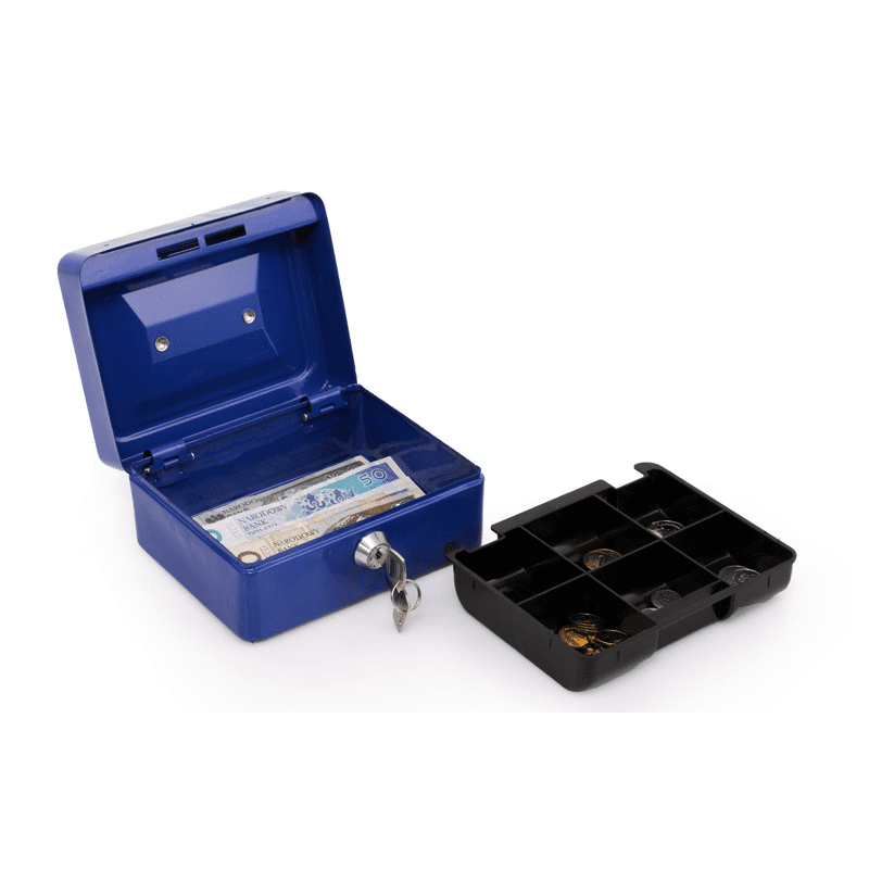 Kovinska prenosna blagajna za denar, dimenzij 150 × 120 × 78 mm. Celoten opis