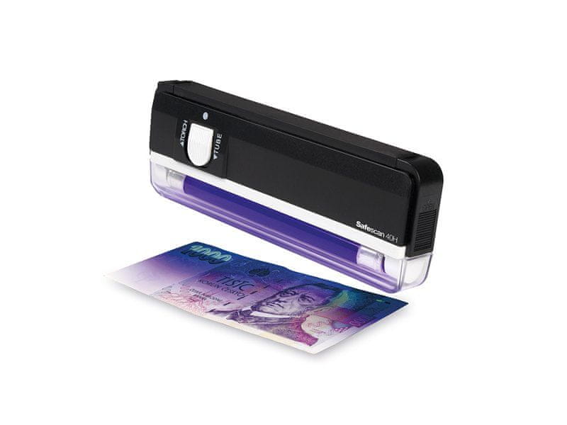 Prenosni detektor za preverjanje pristnosti bankovcev Safescan 40H. 4W UV-žarnica zanesljivo preverja UV-zaščitne elemente. Celoten opis