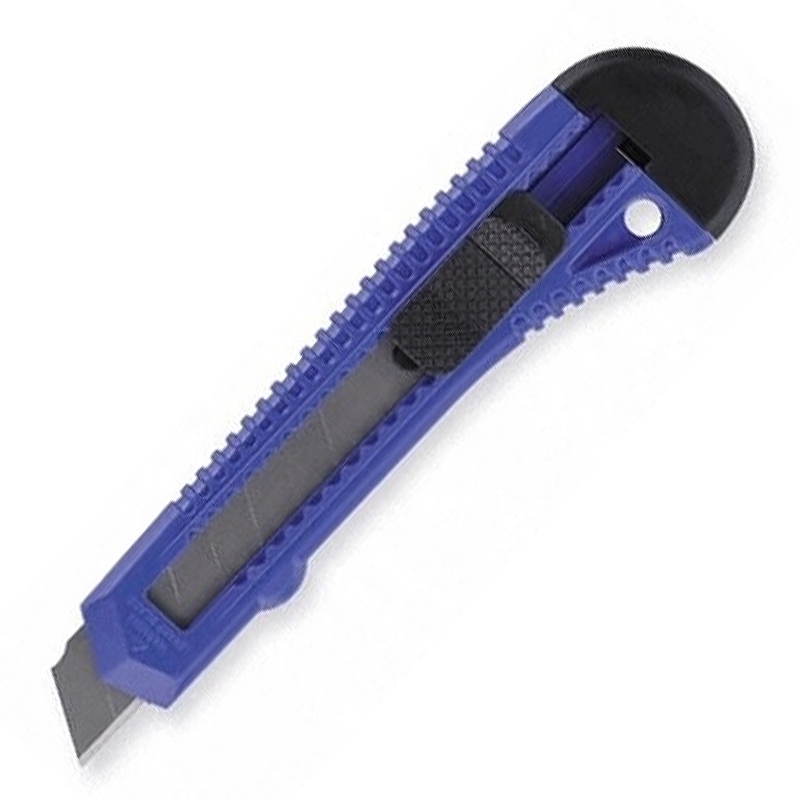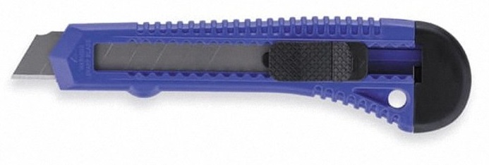 Zavarovan z gumbom, ki zaklene položaj rezila. Noži imajo odlomljiva rezila, ki zagotavljajo dosledno visokokakovosten rezalni rob in visoko togost celotnega rezila kljub segmentirani zasnovi. Ti noži so idealni za lažja dela, kot je rezanje lepilnega traku, papirja, kartona, folije, tapet itd. 18 mm rezilo.