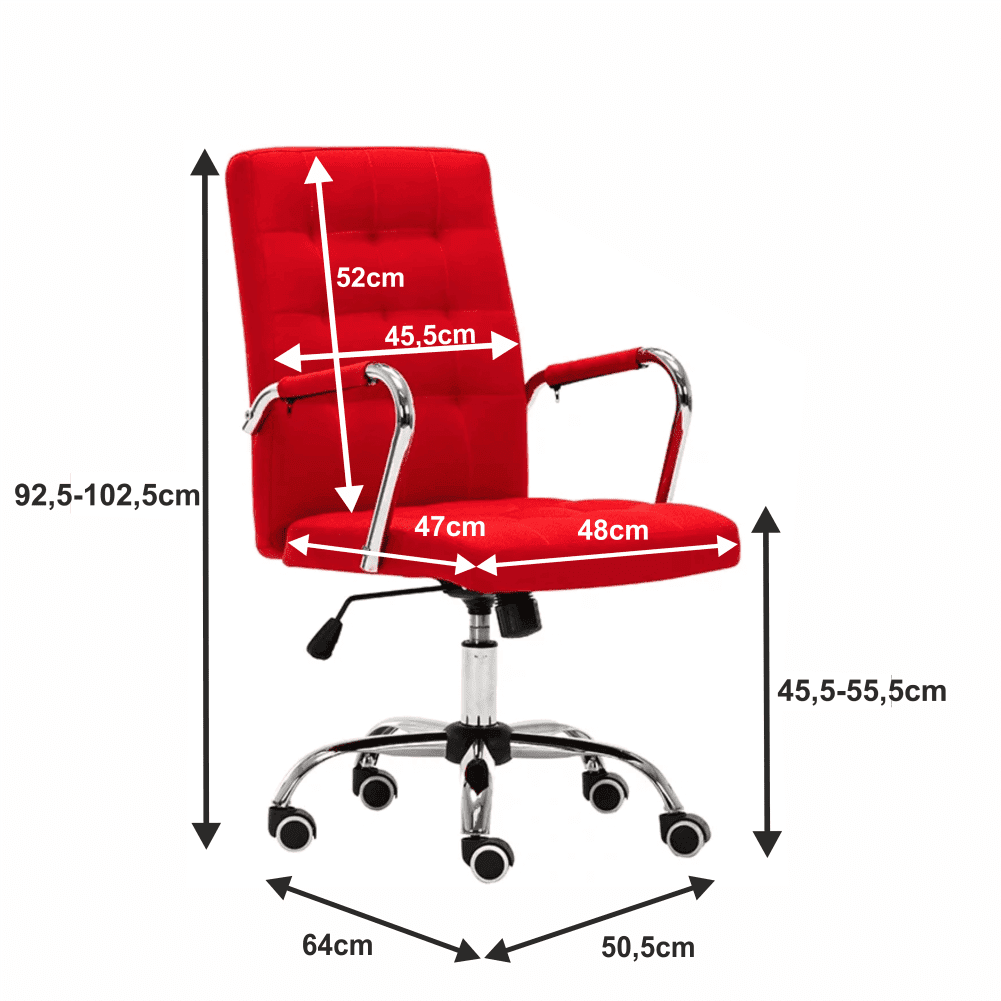 Sodoben pisarniški stol MORGEN vas bo očaral z edinstvenim dizajnom, gugalnim mehanizmom, okrasnimi šivi na hrbtišču in živahno rdečo barvo. Dimenzije fotelja so (ŠxGxV): 50,5×64×92,5–102,5 cm, globina sedala je 49 cm, višina sedišča je nastavljiva med 45,5–55,5 cm. Fotelj odlično dopolnjuje kromirano kovinsko podnožje, na katerem so visokokakovostna gumirana kolesa, primerna tako za lebdeča kot za lesena tla. Udobje tega fotelja dopolnjujejo kromirani nasloni za roke, ki so na sredini oblazinjeni s tkanino. Stol je tudi oblazinjen s 100% poliestrsko tkanino. Nosilnost stola je 100 kg.
