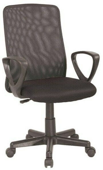 Sodobni vrtljivi pisarniški stol – fotelj. Struktura in nasloni za roke so izdelani iz plastike, oblazinjenje je iz črne membranske tkanine, naslonjalo pa je izdelano iz mreže. Višino sedeža lahko nastavite od 41 do 53 cm. Celoten opis