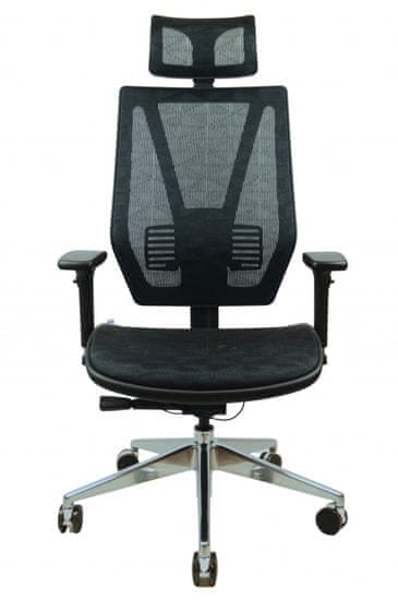 Ergonomsko oblikovano, po višini nastavljivo naslonjalo ima tudi nastavljivo ledveno oporo in je skupaj s širokim sedežem oblazinjeno v zračno samonosno mrežo.