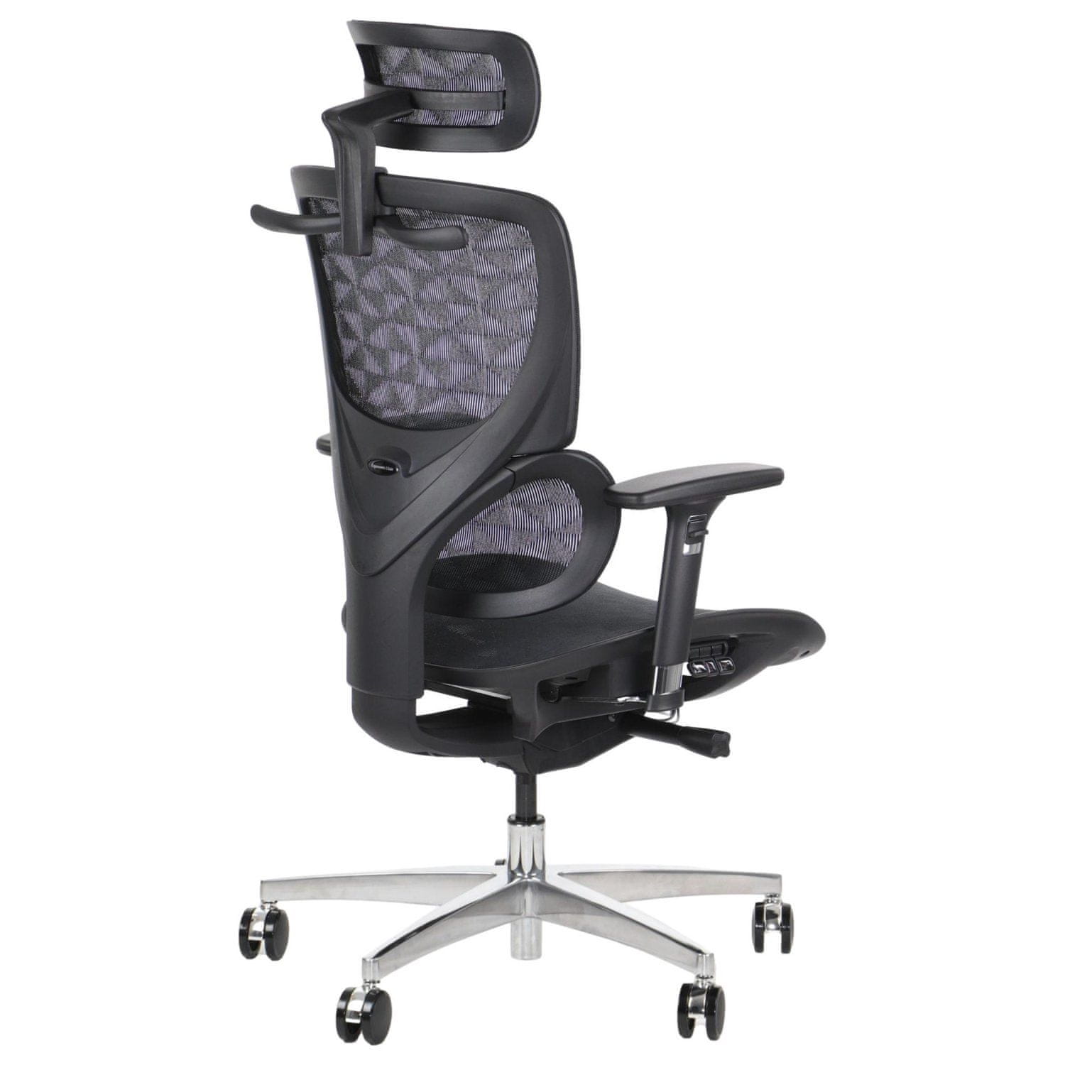 STEMA Ergonomski vrtljivi pisarniški stol ErgoNew S1A. Ima aluminijasto podlago, mehka kolesa, nastavljive 3D naslone za roke, nastavljiv 2D vzglavnik in ledveno oporo. Dvigalo razreda 4. Mrežasti sedež. Čr