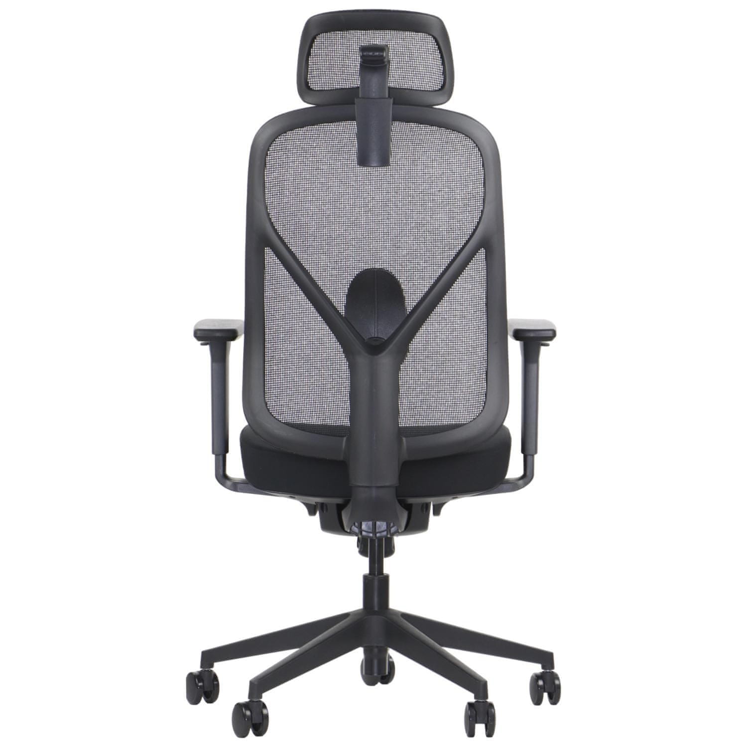 STEMA Vrtljivi pisarniški stol LARCK. Po višini nastavljiv naslon. Najlonsko podnožje, sinhroni mehanizem, podaljšek sedeža, mehka kolesa, nastavljivi nasloni za roke, vzglavnik in ledvena opora. Črna.