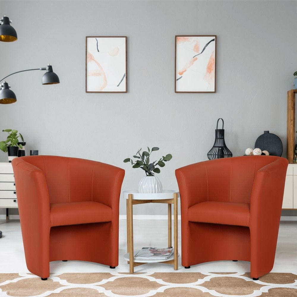 Moderni fotelj CUBA je primeren za kavarne, pisarne ali dnevne sobe. Stol je oblazinjen v oranžno eko usnje, na voljo pa so tudi druge barvne možnosti. Možno je naročiti 5 barvnih odtenkov tkanine Mikrofaza, 6 barvnih odtenkov eko usnja ali 3 barvne odtenke Lava ženilja v kombinaciji z eko usnjem. Višina in globina sedeža je 45 cm.