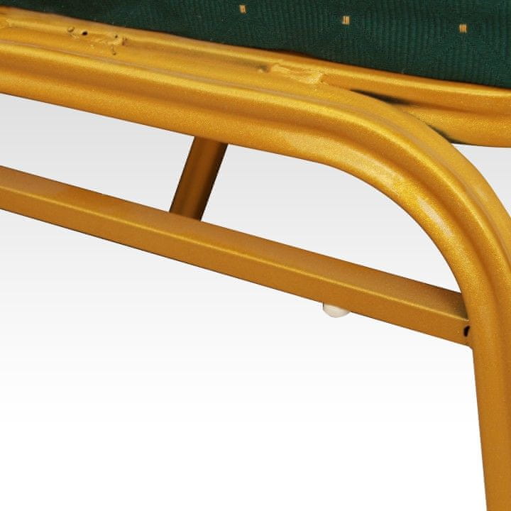 Konferenčni stol ZINA 2 NEW je med zložljivimi stoli, ki jih je mogoče zložiti enega na drugega in tako prihraniti prostor. Stol je primeren za opremljanje družabnih prostorov, kot so restavracije ali sejne sobe. Sedež z naslonom je oblazinjen v blago zelene barve. Struktura je izdelana iz kovine v mat zlatem zaključku. Višina sedeža je 47 cm. Nosilnost stola je 120 kg.