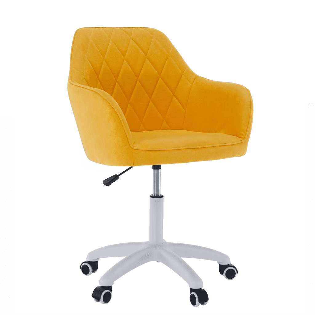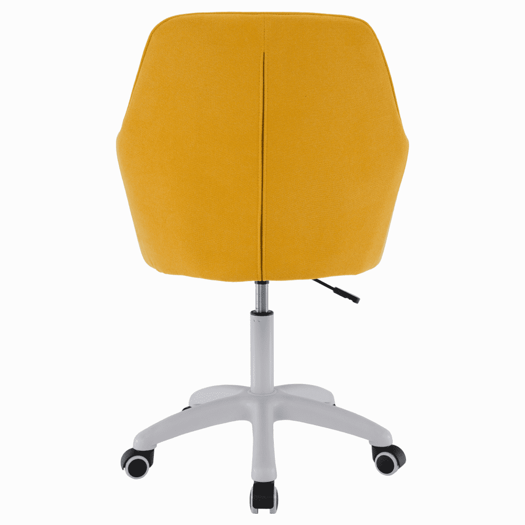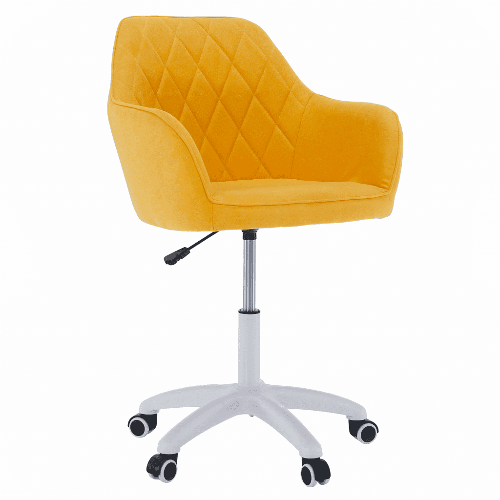 Material: tkanina / kovina Barva: rumena / bela Odpornost tkanine proti obrabi po testu Martindale: 80 000 odrgnin Dimenzije (ŠxGxV): 60×62×85–100 cm Nastavitev višine stola Nastavljiva višina sedeža: 46–61 cm Globina sedeža: 47 cm Maxinajvečja nosilnost: 90 kg vrtljivi peterokraka vrtnica na Celoten opis