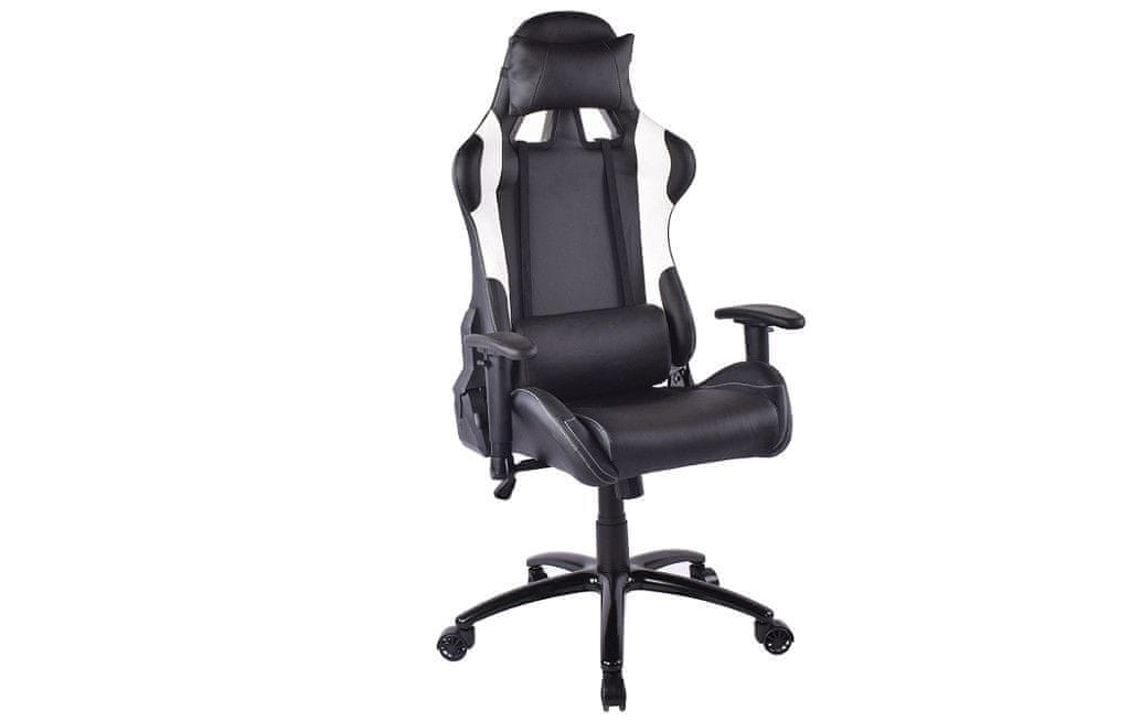 Gaming računalniški stol PER. Ergonomsko oblikovan gaming stol s ledveno blazino. Super dodatek za dom ali pisarno v belo-črni kombinaciji. Stol ima možnost nastavitve višine, nastavitve naslonov za roke ter nastavitev nagiba naslona.