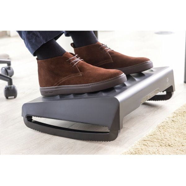 Fellowes BREYTA podnožje v črni barvi za ergonomijo spodnjega dela nog med sedenjem. Je dovolj prostoren, da lahko nanj udobno položite obe nogi. Hkrati je dovolj kompakten za enostavno prenašanje in nameščanje. Zaradi tega je uporaben ne le za pisarniško delo, temveč tudi za domačo pisarno. Pri dolgotrajnem delu z računalnikom, ki je povezano s sedenjem za mizo, zmanjšuje togost nog in podpira naravni položaj celotnih nog.