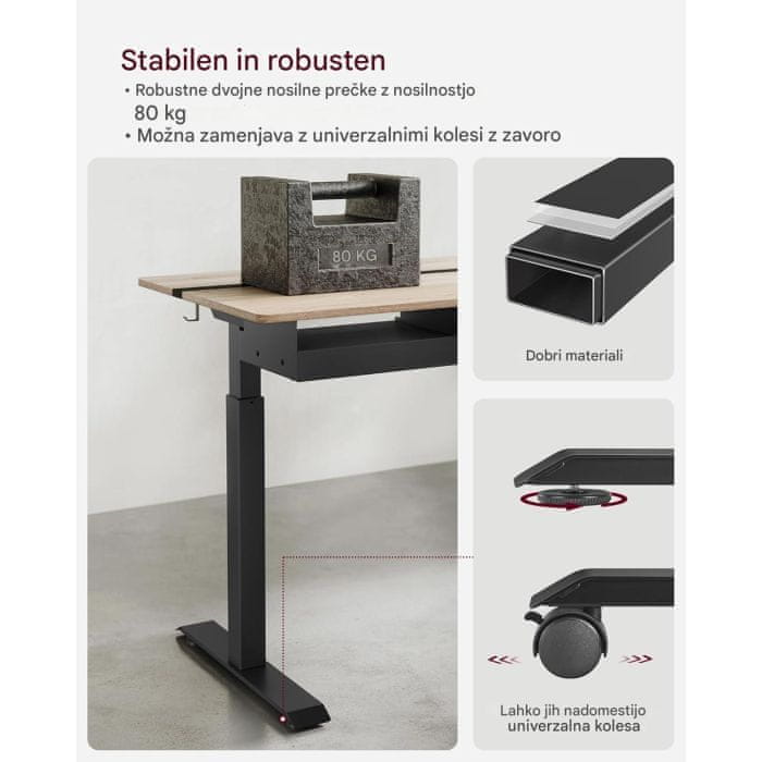 Tiho delovanje: Motor za prilagajanje višine deluje tiho, kar omogoča nemoteno delo brez motečega hrupa.