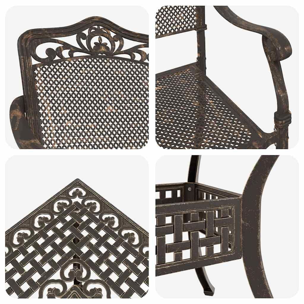 • Kakovostni materiali: Ta vrtna miza in stoli iz litega aluminija imajo robustno, teksturirano površino, ki je prijetna na dotik. Aluminijasta konstrukcija je trpežna, ta set pa bo dolgo izgledal super v vašem vrtu.