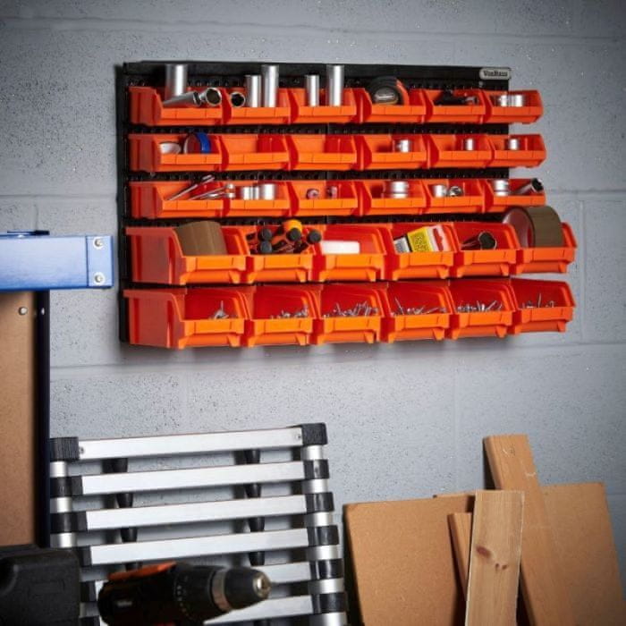 Popoln za shranjevanje velikega števila predmetov, vključno z majhnimi orodji, dodatki in deli, kot so vijaki, podložke, matice, vijaki, žeblji, sponke, pritrdilni elementi in še več! Dobra izbira za delavnice, garaže in lope.