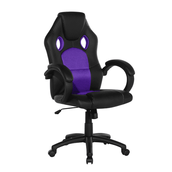 Pri delu, sestankih, učenju ali računalniških igrah pogosto več ur sedimo za pisalnimi mizami. Zato je zelo pomembno, da imate visokokakovosten in udoben pisarniški stol. Vrtljivi stol v dinamičnem športnem in igralnem dizajnu je prevlečen z visokokakovostnim sintetičnim usnjem in zračno vijolično mrežo. Dimenzije stola so 65×65×108–115 cm, sedalna površina 50×51 cm, ki jo lahko s pomočjo plinske vzmeti nastavite med 44 in 51 cm. Ergonomsko ukrivljeni nasloni za roke z udobnim oblazinjenjem spodbujajo sproščeno in zdravo držo. Elegantno oblikovano, oblazinjeno 68 cm visoko naslonjalo z integriranim naslonom za glavo zagotavlja še več udobja, naklon naslonjala pa lahko nastavite po svojih željah. Nagibni mehanizem stola sprošča hrbtenico in omogoča aktivno gibanje med sedenjem. Vrtljivi stol ima pet stabilnih in gladkih varnostnih kolesc. Odličen pisarniški stol za tiste, ki želijo sedeti sproščeno in udobno ter v športnem slogu!