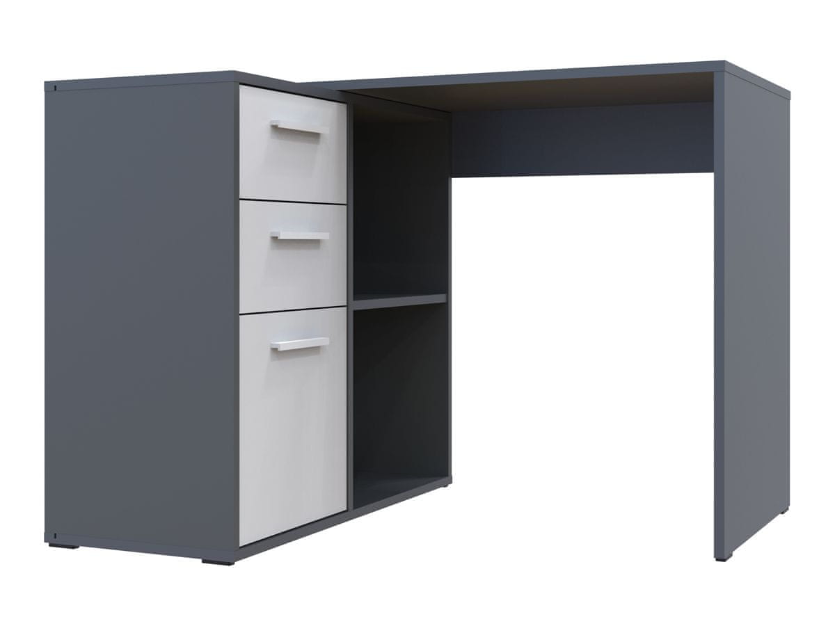 S pravilno izbrano mizo boste brez težav delali, vaši otroci pa se bodo lahko igrali svojih nalog. Pisalna miza TALENT T8 bo postala odličen pomočnik in tudi zanimiv oblikovalski element vaše pisarne ali študentske sobe. Izdelan je iz visokokakovostnih materialov v čudovitem antracit in belem dizajnu, ki sta zelo moderna in popularna. Ob strani mize je omarica z odprtim prostorom za shranjevanje, pregradno polico in tremi predali. Miza je multifunkcionalna, lahko jo postavite v kot ali neposredno ob steno, po vaših željah. Dimenzije mize v kotu zložene (ŠxGxV): 100×83×76 cm in ravno zložene (ŠxGxV): 133×50×74,4 cm. Dostavljen je razstavljen.