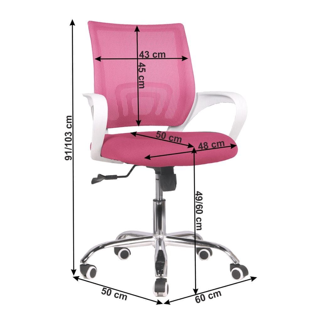 Preprost, a moderen in eleganten pisarniški stol SANAZ TIP 2 bo pritegnil vašo pozornost s svojim dizajnom in praktičnostjo. Dimenzije fotelja so (ŠxGxV): 60×50×91–103 cm. Višina sedeža je nastavljiva v območju 49–60 cm. Globina sedeža je 50 cm, širina sedeža pa 48 cm. Višina hrbtišča je 45 cm, širina pa 43 cm. Stol je izdelan iz roza blaga. Stabilno konstrukcijo zagotavlja kromirana rozeta. Za udobje bodo poskrbeli plastični nasloni za roke v beli barvi, plastična ledvena opora ali gugalni mehanizem. Zagotovo boste cenili gumirana kolesa, ki so primerna tako za lesena kot lebdeča tla. Nosilnost stola je do 110 kg in se dostavi v razstavljenem stanju.