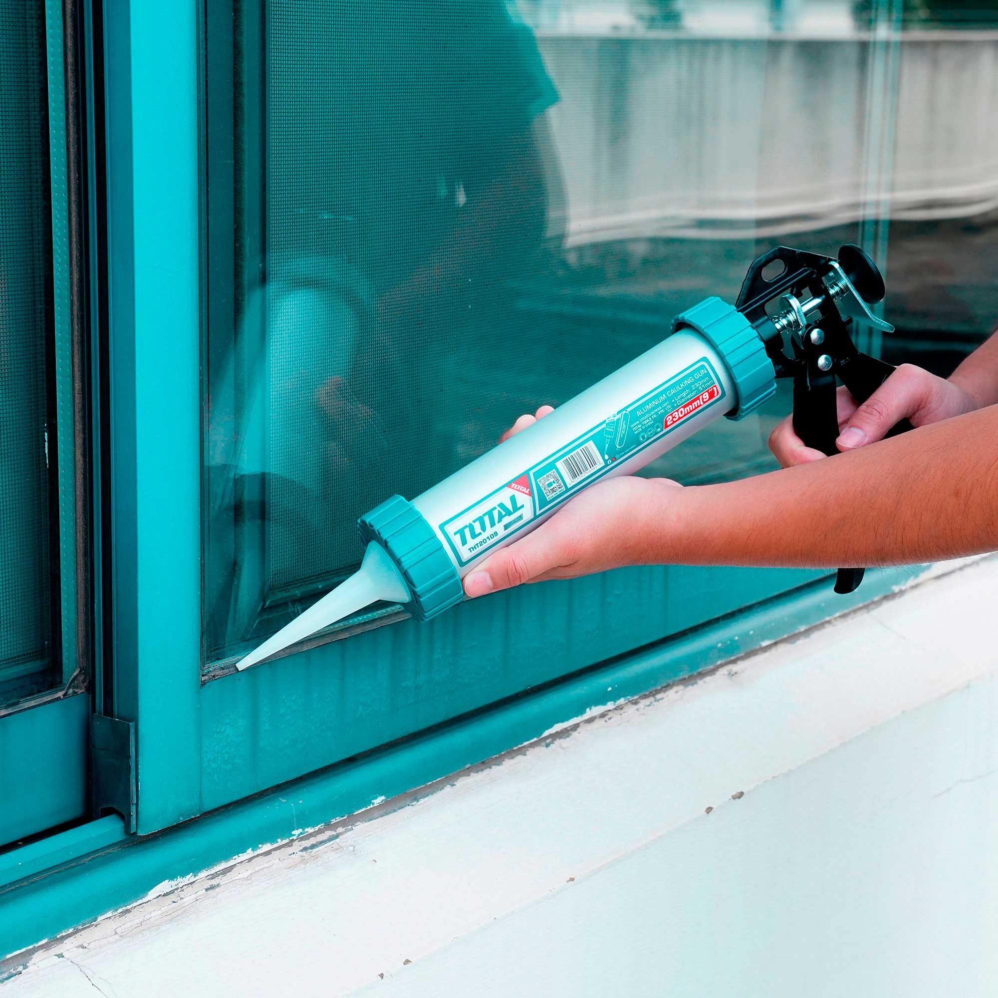 Mehanska pištola za tesnilne mase TOTAL THT20109 (serija Industrial) se uporablja pri montažnih in gradbenih delih. Namenjena je enostavnemu nanašanju tesnilne mase iz kartuše na površine za tesnjenje različnih šivov, prostorov in lukenj. Dolžina orodja je 230 mm, premer pa 51 mm. Je združljiva z tesnilnimi masami v polietilenski embalaži (v tem primeru kartuša deluje kot embalaža), pa tudi z masami v kartuši. Zaradi zaprtega kovinskega ohišja in trpežnega ročaja se ta model odlikuje s svojo dolgo življenjsko dobo. Odporen je proti mehanskim poškodbam in je primeren za intenzivno uporabo. Ergonomski ročaj zagotavlja udobno uporabo.