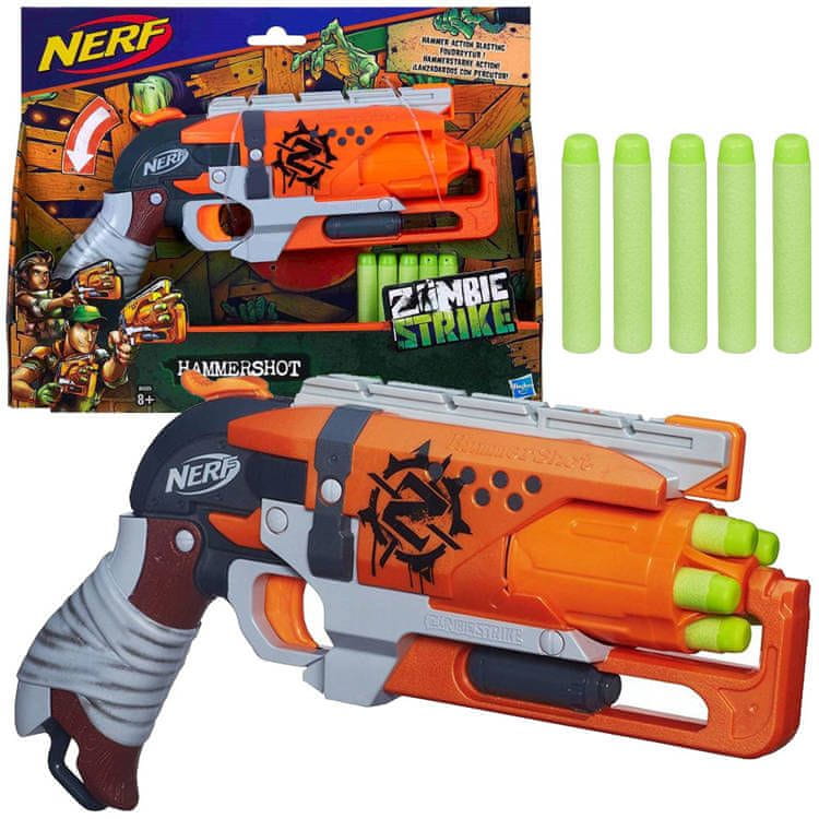 Nerf Zombie Strike Hammershot je priročna penasta pištola za boj proti zombijem! Revolver je priročen in enostaven za uporabo, kot zagotavlja Nerf. Hammershot je prvi enoročni izstreljevalec v seriji Zombiestrike. Izstrelitev ima rotacijski nabojnik s petimi puščicami. Izstrelitev se ponovno napolni tako, da s palcem premaknete oranžni sprožilec in nato samo pritisnete na sprožilec, da sprožite (mlajši otroci bodo morali za ponovno nalaganje uporabiti drugo roko). Izstrelitev ima eno taktično tirnico in ročaj, skozi katerega potegnete trak. Skupaj z lansirnikom dobimo 5 puščic iz zombi serije. Pištola je v celoti izdelana iz plastike, naboji pa iz pene z gumijastimi konicami.