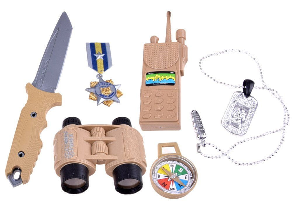 Vojaški komplet je plastični komplet za dečke, ki želijo prevzeti vojaške barve, in bo izpolnil zahteve vsakega mladega vojaka. Bež komplet, ki vključuje telovnik, orožje in zaščitno masko, bo prišel prav na marsikaterem sprehodu ali vojaški igri.