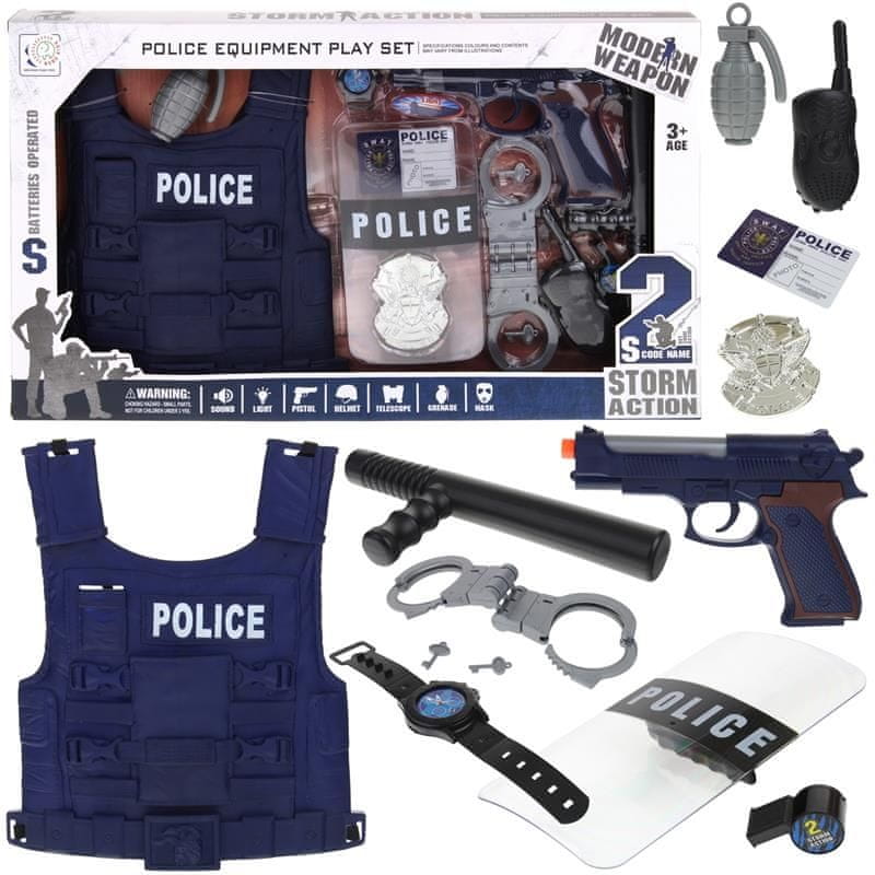 Če vaš sin sanja o tem, da bi postal policist, imamo nekaj popolnega! Z opremo, ki je v kompletu, bo vaš otrok poskrbel za red v krogu, v domu in na dvorišču.. LASTNOSTI: – Ko pritisnete na sprožilec, se na cevi prižge zvok, kot v realističnem orožju. – Vsebuje vse potrebne pripomočke, da postanete policisti ali policistke vesele zabave KOMPLET VKLJUČUJE: – neprebojni jopič – pištolo – voki-toki – granato – policijsko značko – policijsko izkaznico – lisice s ključem – palico – piščalko Predlagana minimalna starost (glede na podatke proizvajalca na embalaži): 3 leta+Število elementov: 11Dimenzije jopiča: 28,5 (Š) x 33 (V) cmDolžina palice: 21 cmVišina granate: 10 cmDimenzije pištole: 3,5 (Š)x 21,5 (D)x14,5 (V) cmNapajanje pištole: 3 baterije AG10 1,5V (demo baterije vključene)Dimenzije pr pakiranje: pribl. 60 (Š) x 5,5 (G) x 33,5 (V) cm Podatki o proizvajalcu: Ni primerno za otroke, mlajše od 36 mesecev. Vsebuje majhne dele, ki jih je mogoče zlahka pogoltniti ali vdihniti. Nevarnost zadušitve.