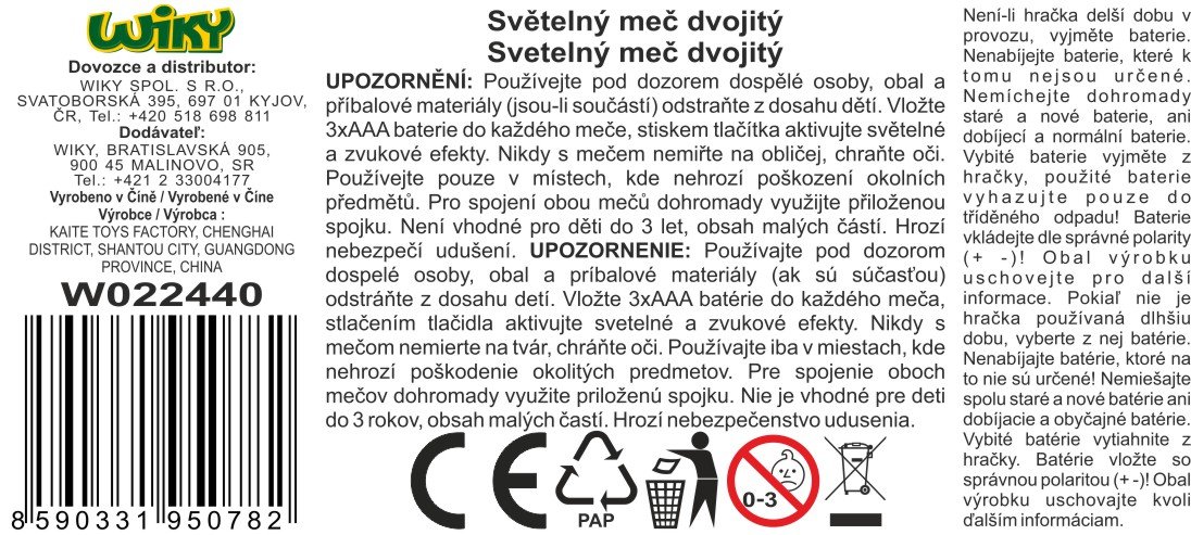Dvojni svetlobni meč. Velikost 138 cm. Vključuje 2 meča in sklopko z ročajem za priročno vrtenje dvojnega meča okoli svoje osi. Svetlobni in zvočni učinki. 3×AAA baterije (za vsak meč) niso vključene. Učinki se aktivirajo z gumbom na ročaju.