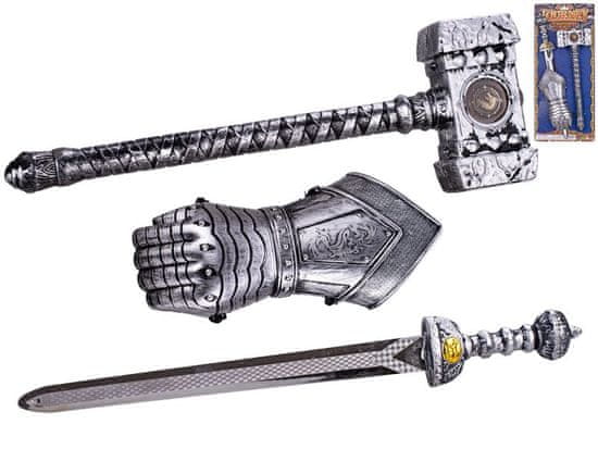 Komplet orožja. Vsebina paketa – rokavice, meč 50 cm, kladivo 39 cm. Celoten opis