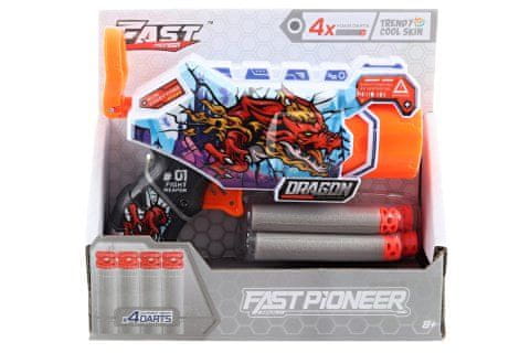 Pištola za nabojnike iz pene z motivom zmaja. Vključeni so 4 naboji. Material plastika. Pakirano v odprti škatli. Mere paketa 16×15×5,5 cm. Priporočena starost 8+