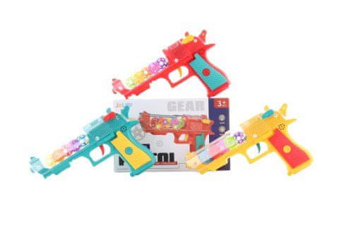 Pištola se ob pritisku na sprožilec prižge, oddaja zvoke streljanja in vrti zobnike. Napajanje z 2 baterijama AA, ki nista vključeni. Material plastika. Pakirano v škatli. Dimenzije paketa približno 19,5×12×4,5 cm. Velikost pištole približno 20 cm. Starost 3+