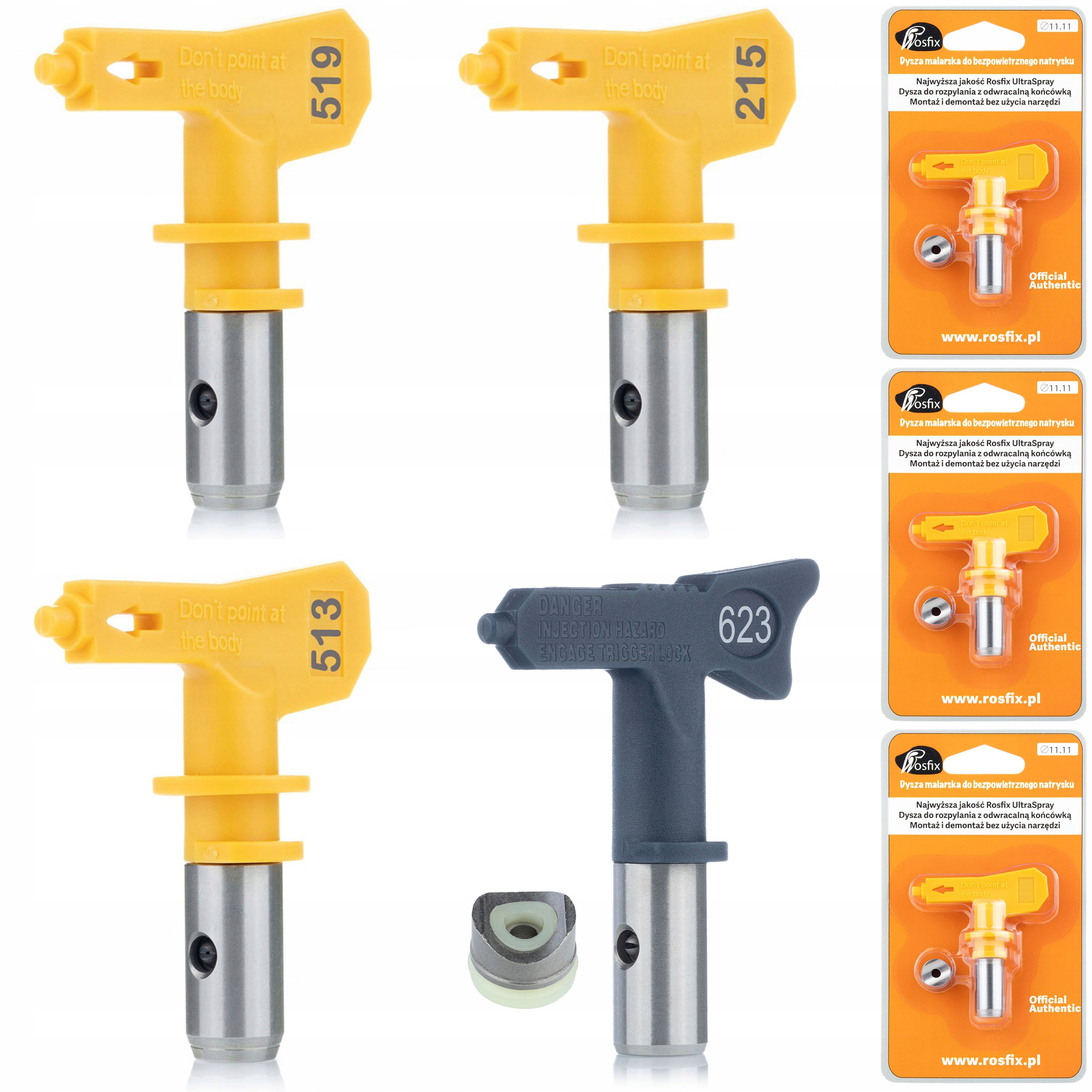 ✔️ Dysza 215, 413, 519, oraz 623: Wyjątkowo skuteczne dysze, która zapewniają równomierne rozpylanie farb o różnej konsystencji. Doskonale nadają się do akryli, emulsji, uretanów, epoksydów oraz lateksów. Dysze 413 zastosujesz do nakładania gruntu.