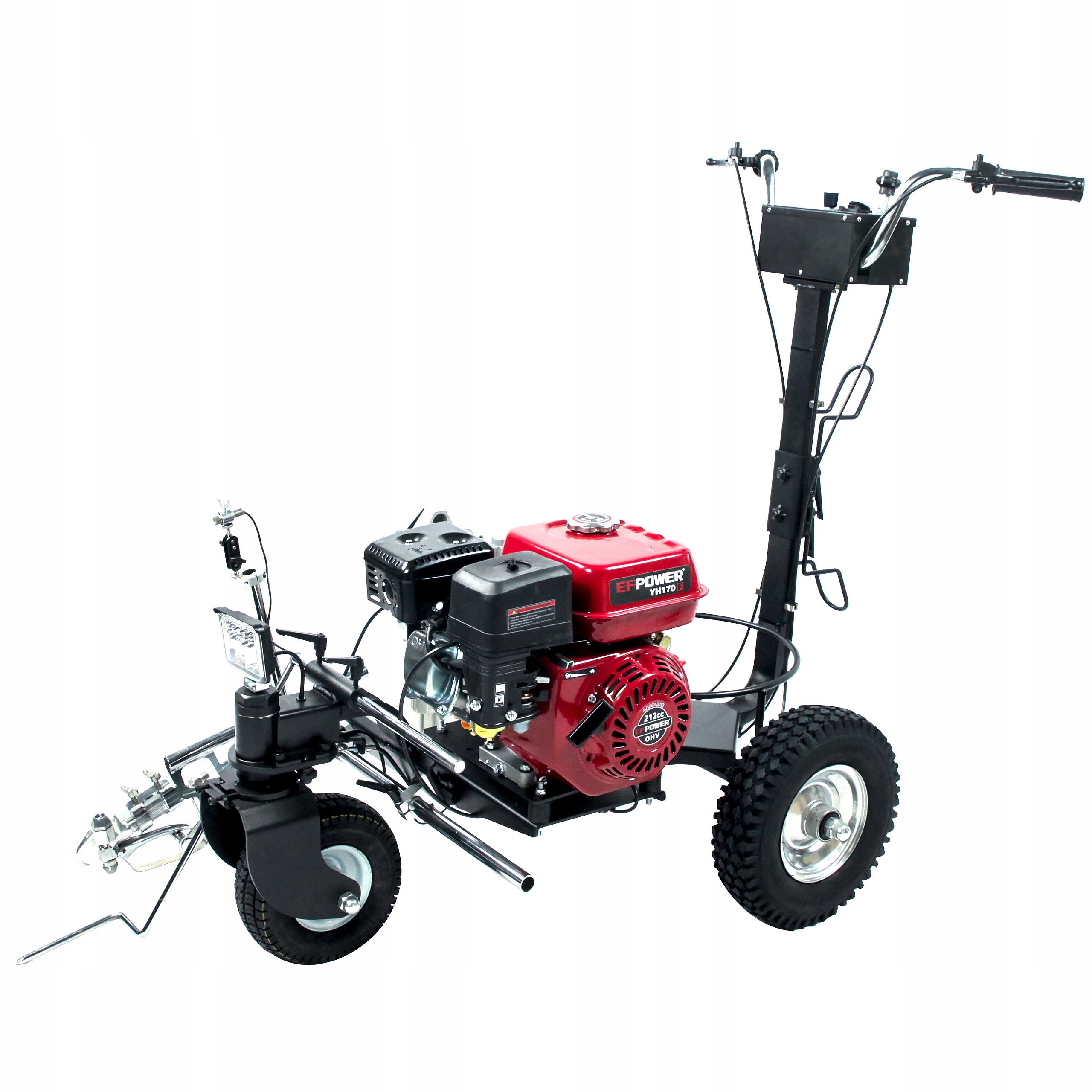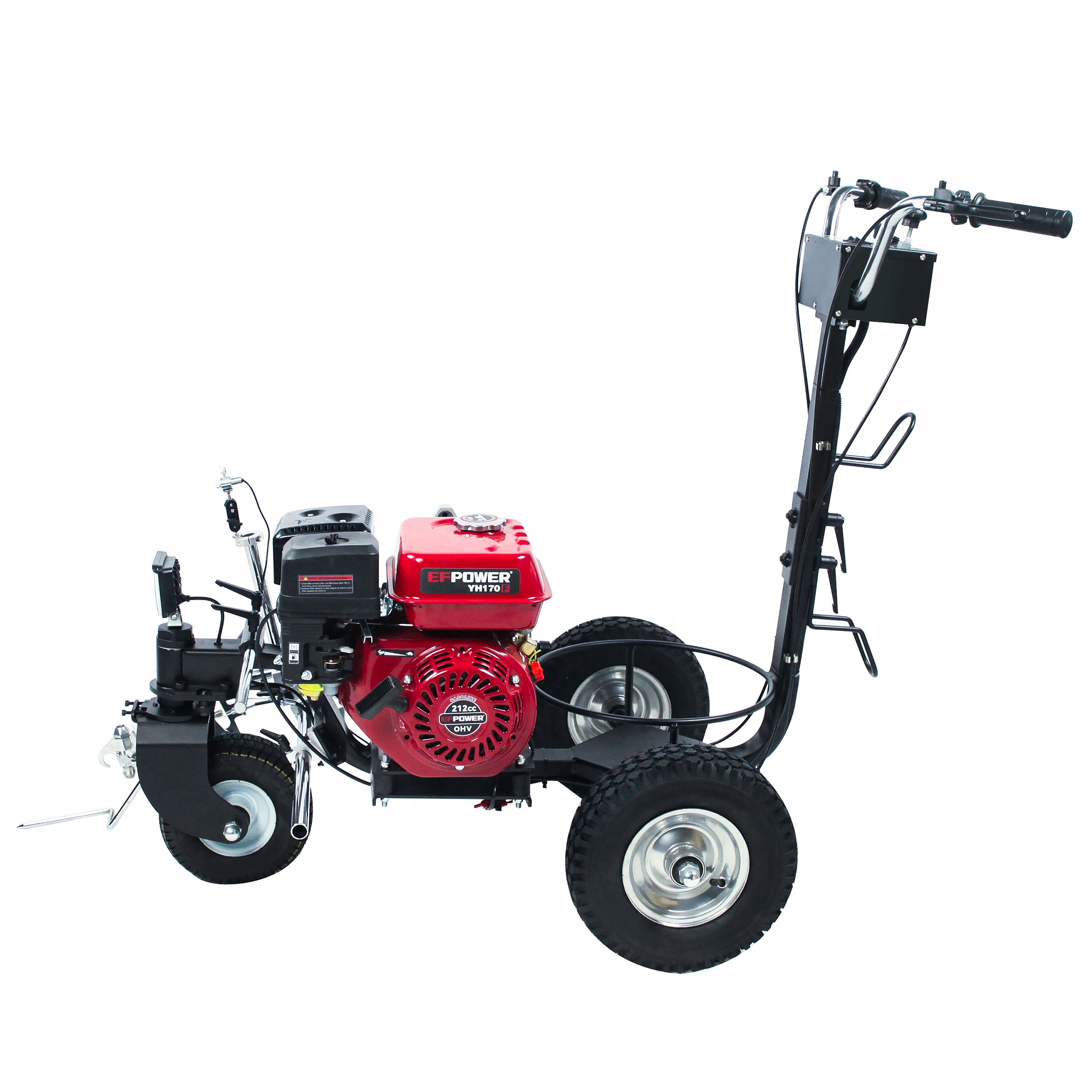 Lewy spust umożliwia zablokowanie koła skrętnego, co pozwala na precyzyjne prowadzenie malowarki i utrzymanie idealnie prostych linii. Dzięki temu praca jest bardziej komfortowa, a oznakowanie dróg wyjątkowo dokładne.