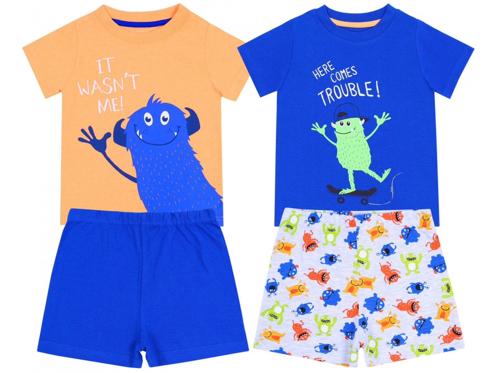 2 x Modro-oranžna fantovska pižama, sestavljena iz majice s kratkimi rokavi in kratkih hlač.Pižama z motivom pošasti.Hlače z elastiko v pasu.Ima certifikat OEKO-TEX STANDARD 100, ki zagotavlja, da materiali ne vsebujejo škodljivih snovi.Izdelana je iz mehkih in prijetnih materialov na dotik. Sestava Celoten opis