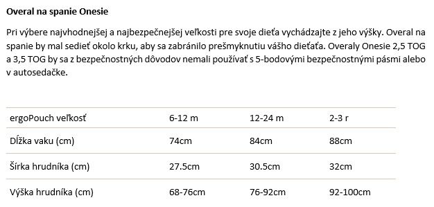 Onesie 2,5 TOG bo dojenčke med spanjem grel pri sobnih temperaturah od 17 do 23 °C. Vrednost TOG pomeni, da pri uporabi tega izdelka v otroški posteljici ne potrebujete dodatnih odej, zato je varna možnost za spanje. Starši lahko upoštevajo BREZPLAČNI sobni termometer in vodnik Kaj nositi, ki sta priložena izdelku, ter pod njiju ustrezno položijo odejo, da bo otroku toplo.