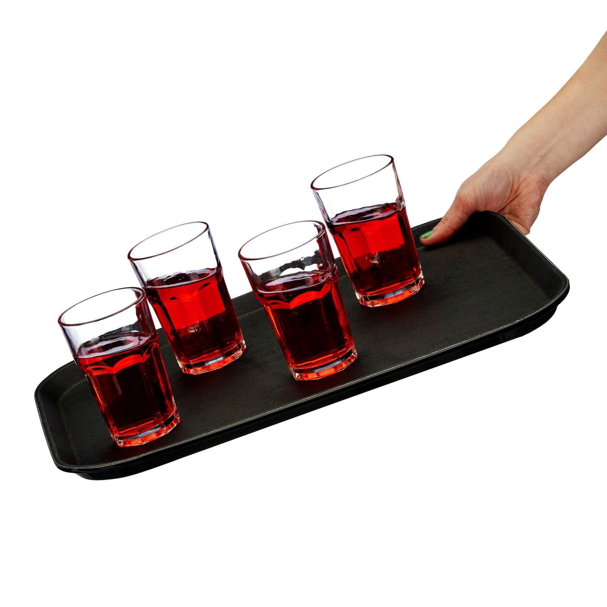 Za učinkovito postrežbo pijače servirni pladnji v setu dveh kosov nudijo nedrsečo površino in visok rob Primerni so za gostinstvo ter omogočajo varen transport brez razlitja. Celoten opis