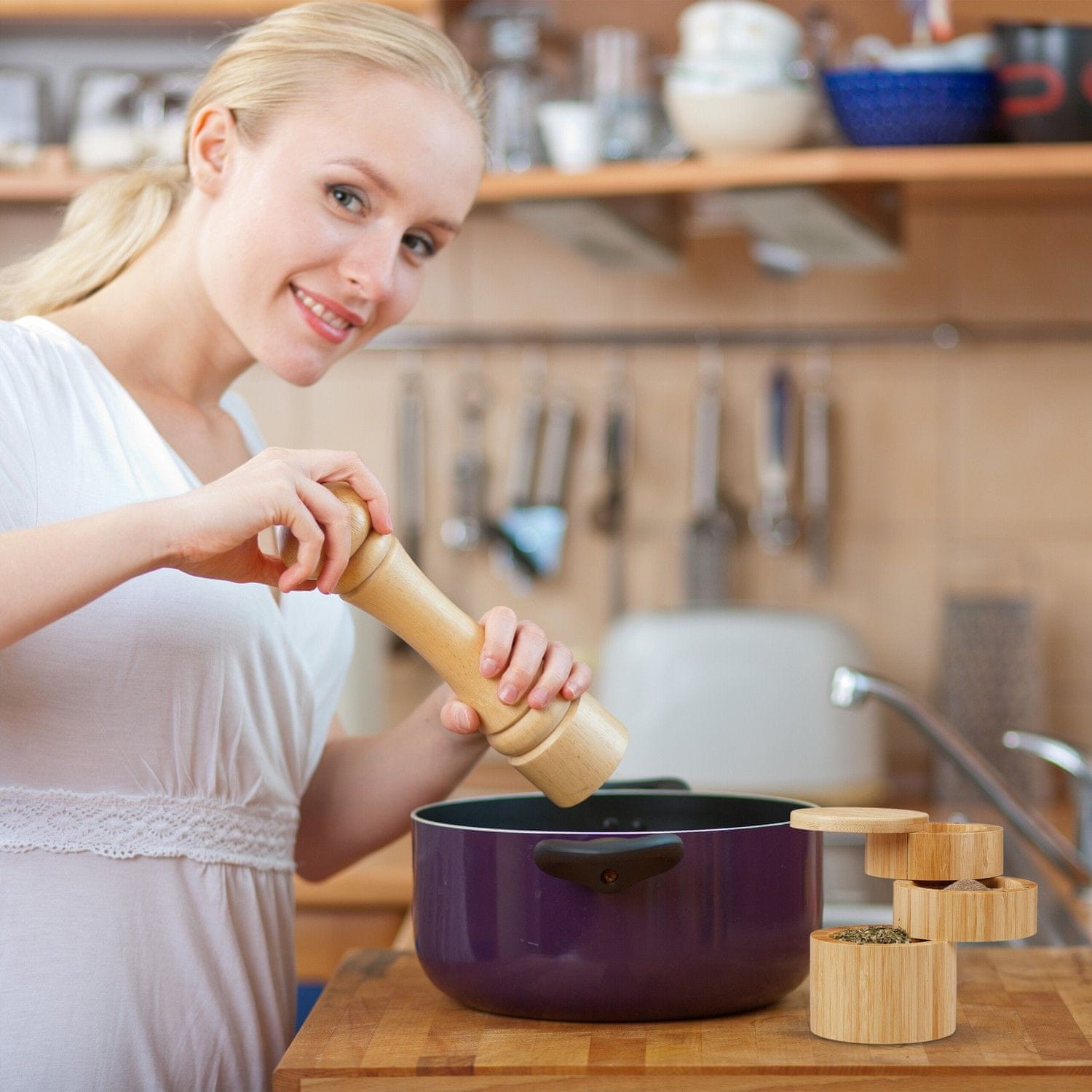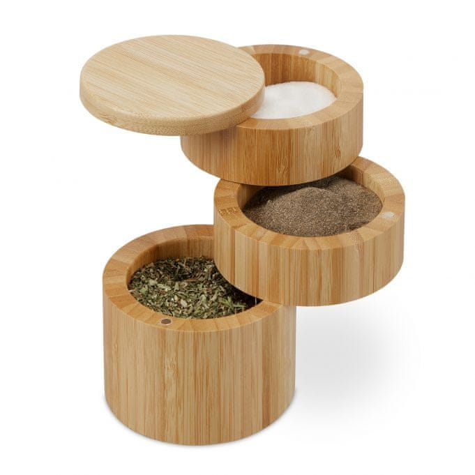 Škatla za sol iz bambusa z bambusovim pokrovom ponuja priročno shranjevanje začimb, tako da so vaše najljubše začimbe vedno na dosegu roke. Njegovi vrtljivi predelki ohranjajo sol, poper in zelišča organizirane in sveže.