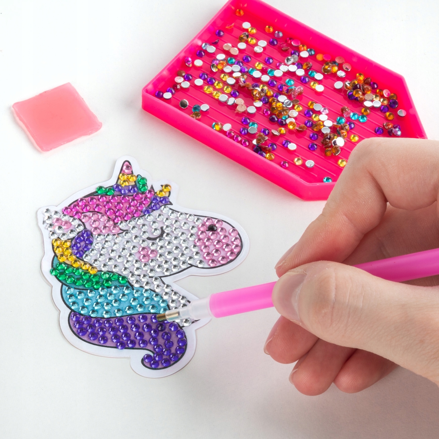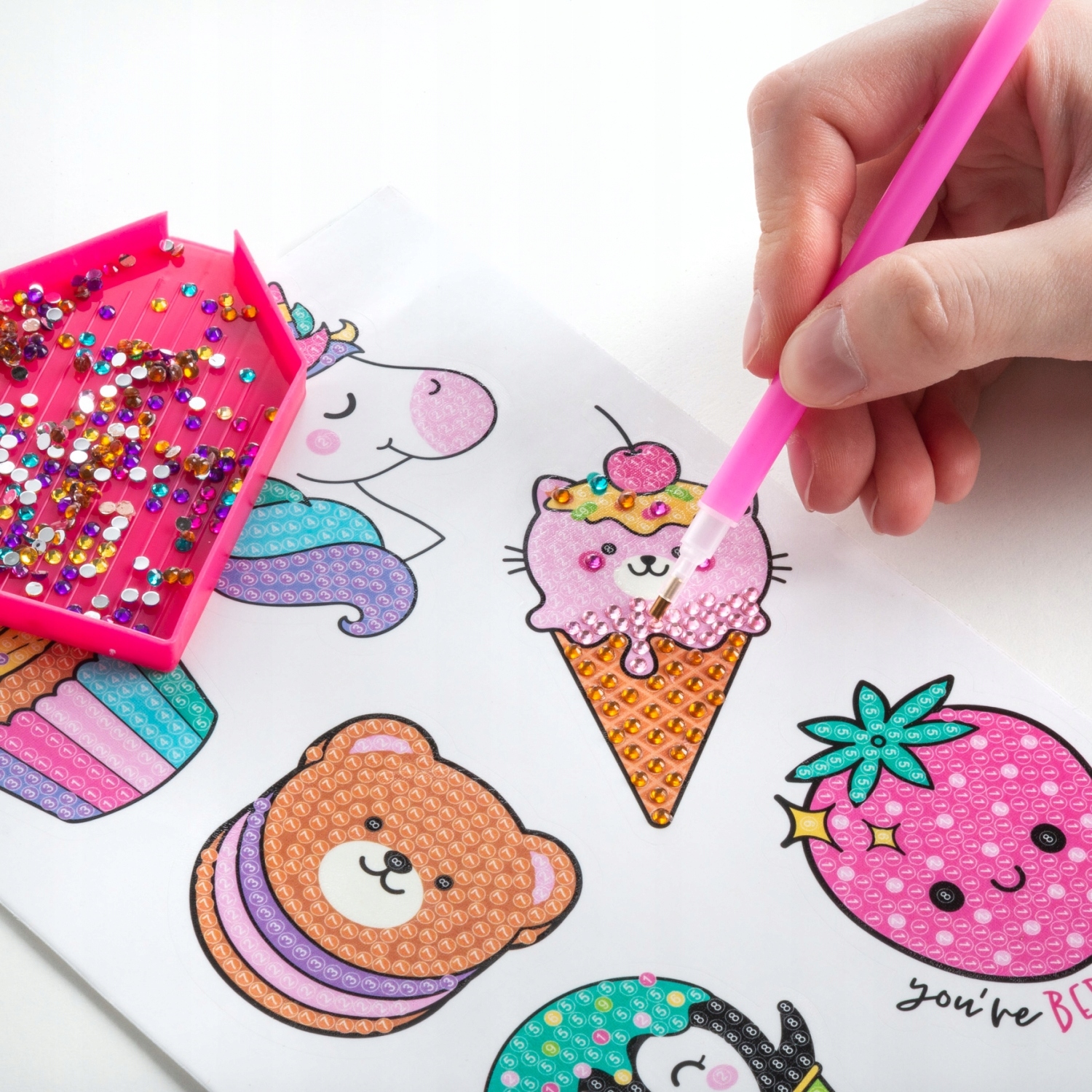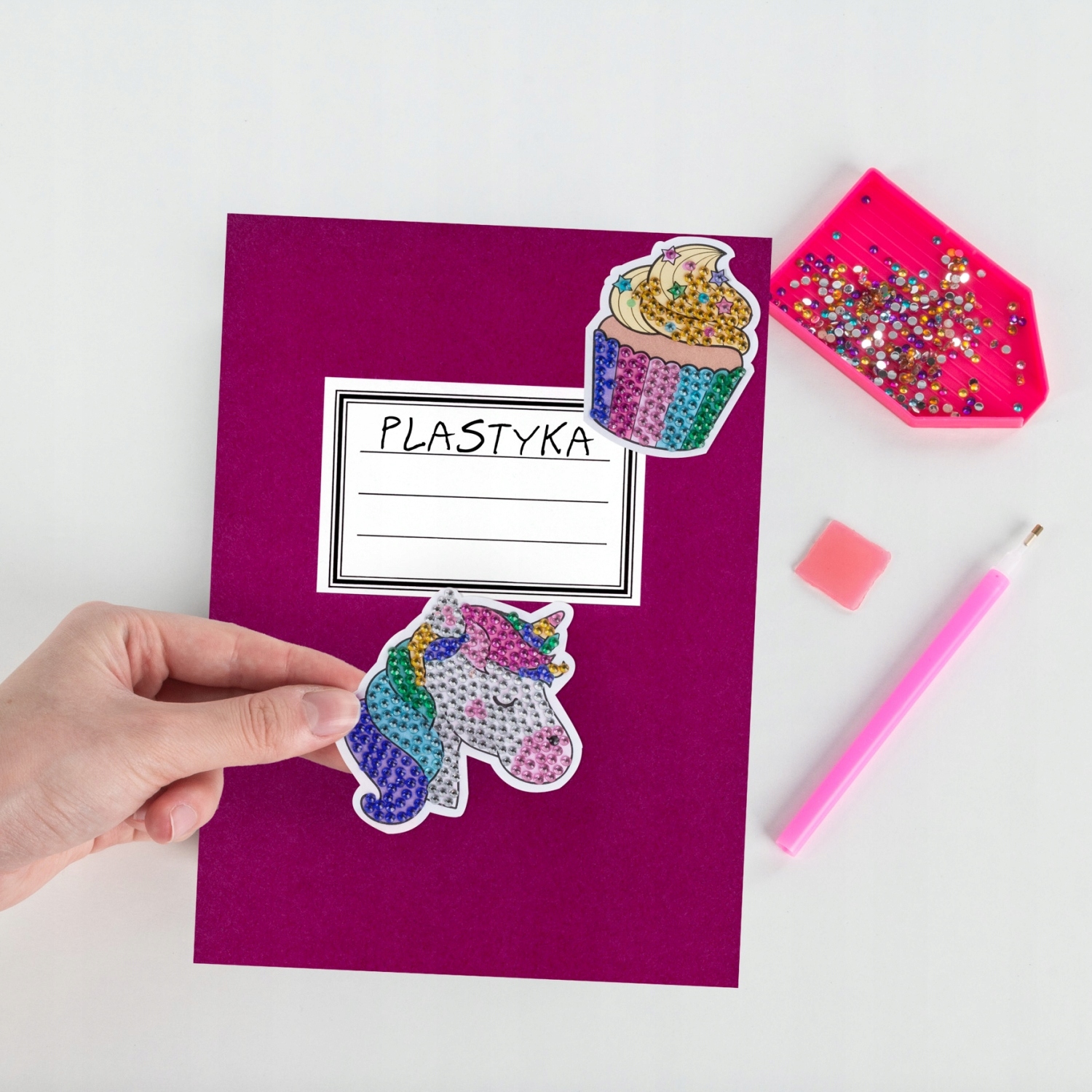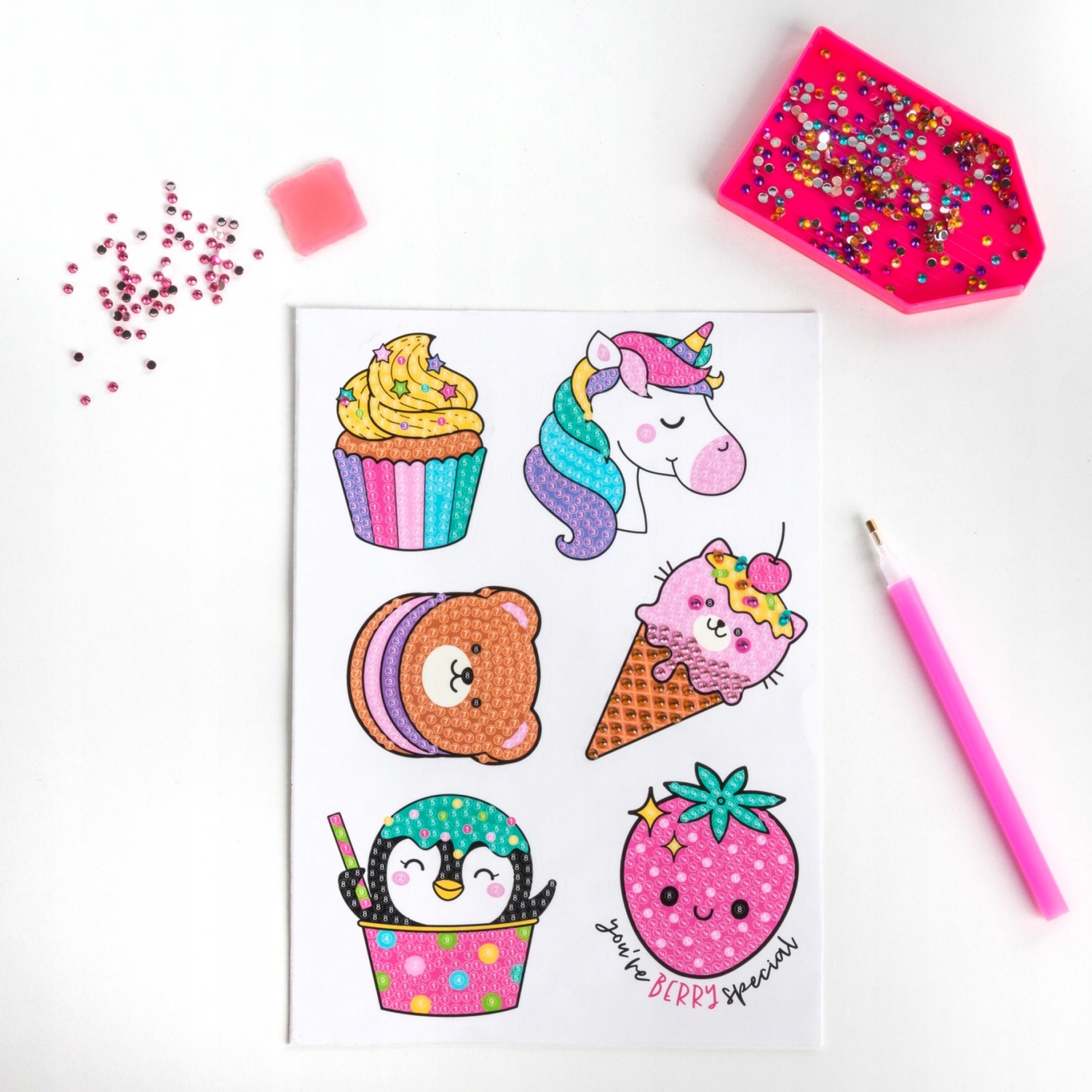 Kreativen komplet za dekoracijo znamke Kidea. Vključuje 6 očarljivih nalepk s samorogom, kolačkom, jagodo, kornetom za sladoled, pingvinom in medvedkom. Za dekoracijo se uporablja 500 svetlečih kristalov v 9 odtenkih, skupaj s potrebnimi dodatki: aplikatorjem, pladnjem in voskom. Polaganje bleščečih mozaikov vas ne le sprosti in pomiri, temveč tudi spodbuja vašo domišljijo in ročne spretnosti. Že pripravljene nalepke lahko uporabite za okrasitev zvezkov, knjig ali pohištva, saj jim dodajo sijaj in značaj. Primerne so tako za zabavo kot darilo za mlade umetnike.