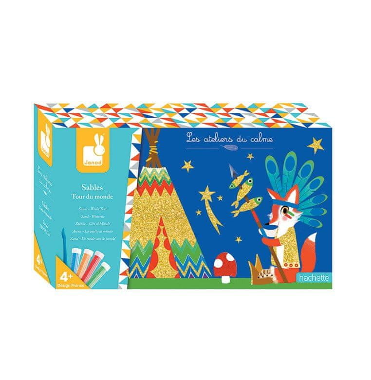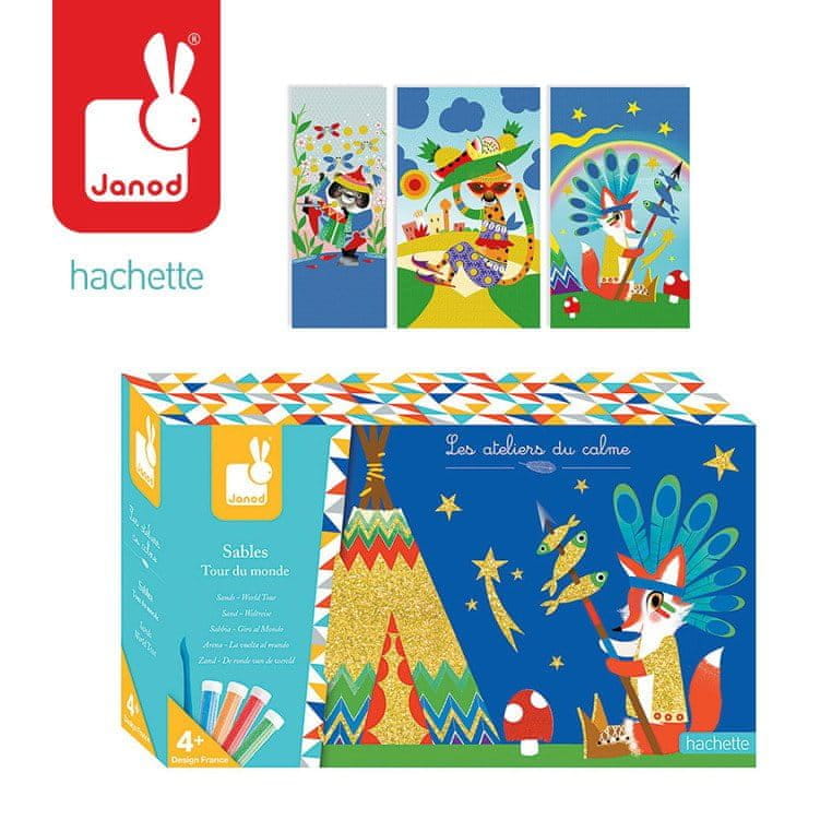 Komplet za ustvarjanje s peskom Potovanje okoli sveta francoske blagovne znamke JANOD je prava poslastica za ljubitelje umetnosti in obrti Barvit komplet vsebuje 3 slikovne plošče s samolepilnim premazom, na katerih so živali v kostumih, značilnih za določeno regijo sveta Te ilustracije lahko na za to določenih mestih potresete s priloženimi peskovniki v 4 barvah: rumeni, zeleni, rdeči in modri Pesek se oprime slik in pusti drobnozrnato teksturo Komplet vključuje tudi lopatico za razkrivanje površin, ki jih želite okrasiti