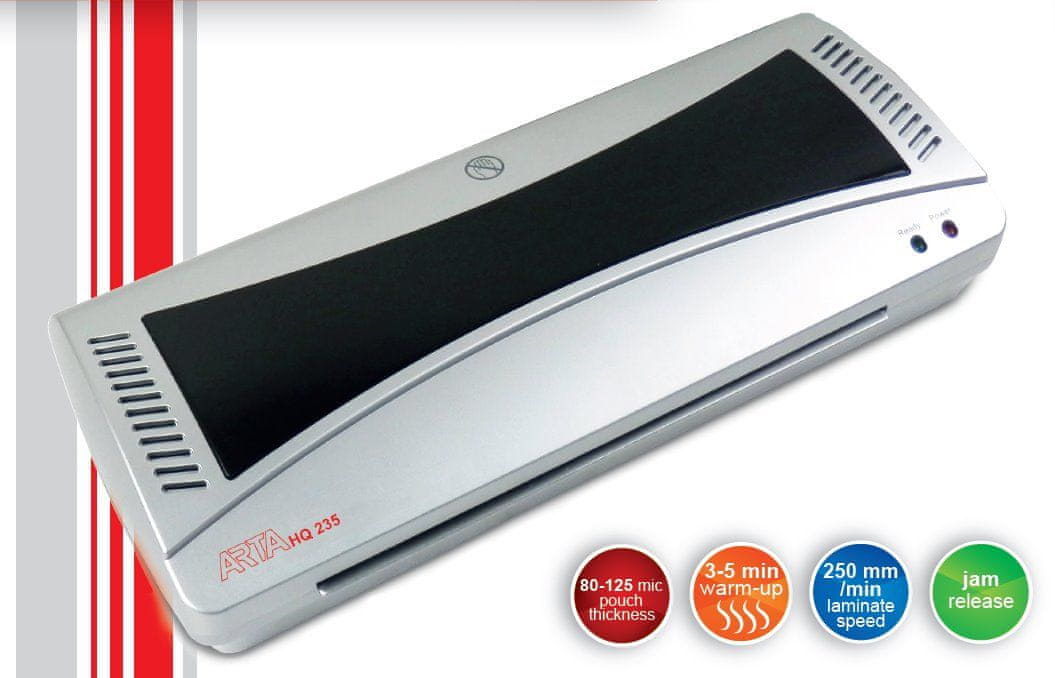 Pisarniški laminator HQ 335 francoskega proizvajalca DSB se spremeni v ARTA. Laminator je primeren za manjše pisarne in občasno laminiranje. Lamelira lahko toplo in hladno do največje velikosti A3 in debeline folije 125 mikronov. Ustvarja visokokakovostne izdelke brez mehurčkov.
