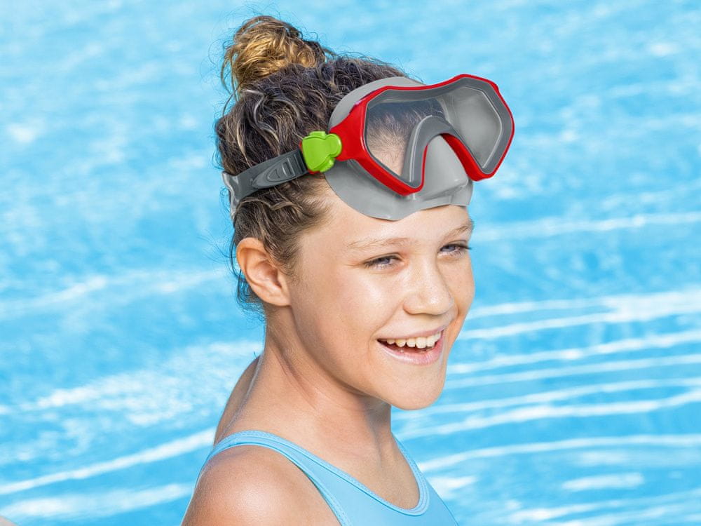 Bestway® Crusader Mask je pisana plavalna maska, namenjena otrokom od 7. leta starosti in bo zagotovo dobro delovala pri prvih urah plavanja. Ustvarjen je za udobje in varnost najmlajših med odkrivanjem morja. Zahvaljujoč nastavljivim trakom se maska enostavno prilagodi glavi uporabnika. Maska je izdelana iz polikarbonata, zaradi česar je odporna na udarce. Ima premaz, ki ščiti pred UV sevanjem, ščiti otrokove oči pred ostrimi sončnimi žarki ter pri potapljanju in potapljanju v vodi.
