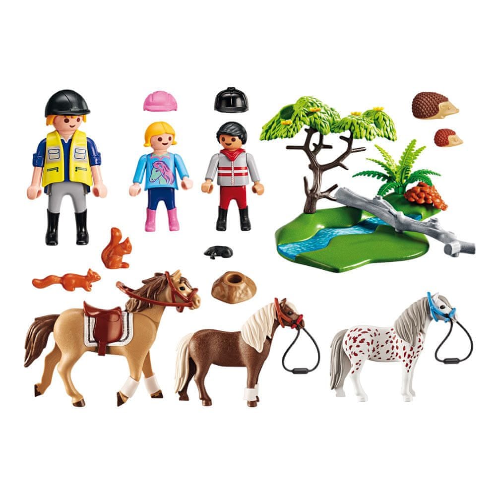 Končno boš lahko odpeljal ponije na sprehod – prav gotovo boste uživali skupaj! V kompletu boš zasledil/a tri ponije in tri figurice, natančneje dve jahačici in njihovega inštruktorja. Jahačici sta nosita čelado in lahko jezdita brez sedla. Ob vsem prejmeš še potoček in drevo. Igrača je primerna za otroke, stare od 4 do 10 let.
