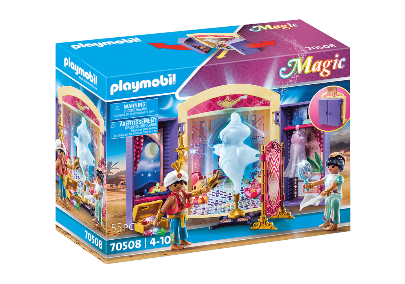 Orient je kraj čudovitih zgodb in pravljic. Med potepanjem po palači sta princ in princesa odkrila skrivnostno čarobno svetilko. Ko se ga dotaknejo, se pojavi džin. Ali jima bo izpolnila tri želje? Igralne škatle PLAYMOBIL ponujajo odlično zabavo na poti. Vse figure in dodatke lahko hitro shranite v škatlo, zaradi praktičnega ročaja pa lahko igralni set preprosto vzamete s seboj kamor koli.
