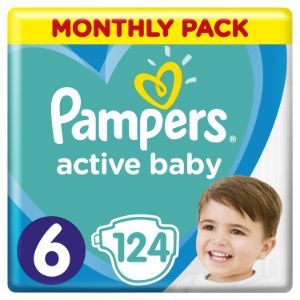 Pampers plenice Active Baby 6 Extra Large, veliko pakiranje po 56 kosov. Plenice vsebujejo majhne kroglice MicroPearls, ki omogočajo da absorbirajo do tridesetkrat več vlage od običajnih plenic.