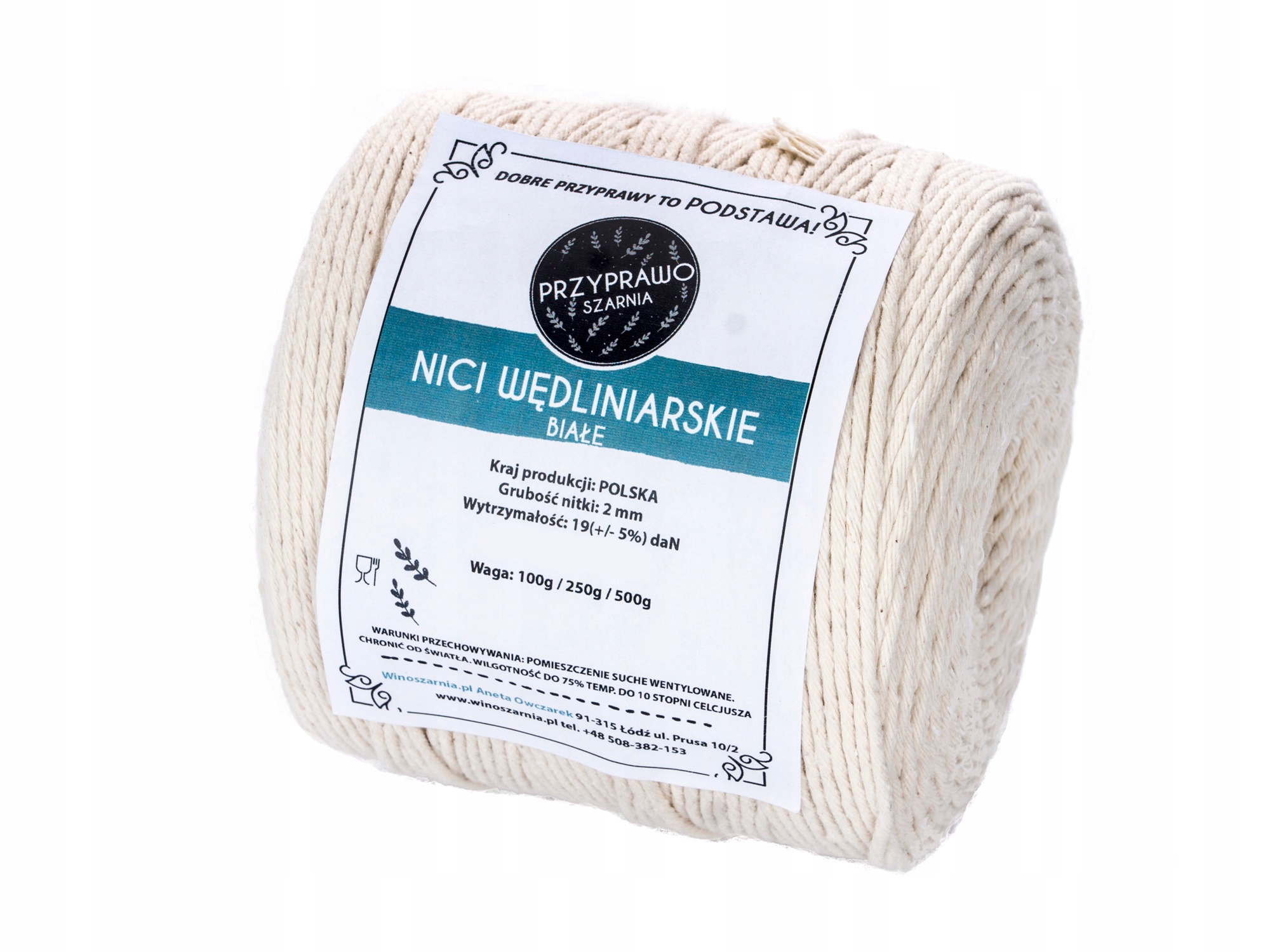 Bele bombažne niti za klobase – za peko, kuhanje, sušenje, dimljenje. Uporabljajo se za ročno vezanje mesa namenjenega dimljenju in za kuhanje rulad na pari za peko. Naravni materiali omogočajo toplotno obdelavo mesa (do 240°C) brez spremembe arome in okusa. Vrvica je trpežna, meso se lahko obesi na kavelj.