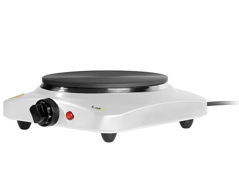 Električni štedilnik z eno ploščo in največjo močjo 1500 W. Ima nastavljiv termostat z gumbom na sprednji strani in indikatorsko lučko.
