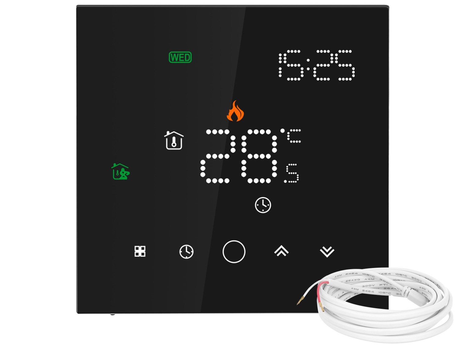 Krmilnik ima vgrajen senzor sobne temperature in je standardno opremljen tudi z žičnim senzorjem temperature tal NTC. Barva: črna