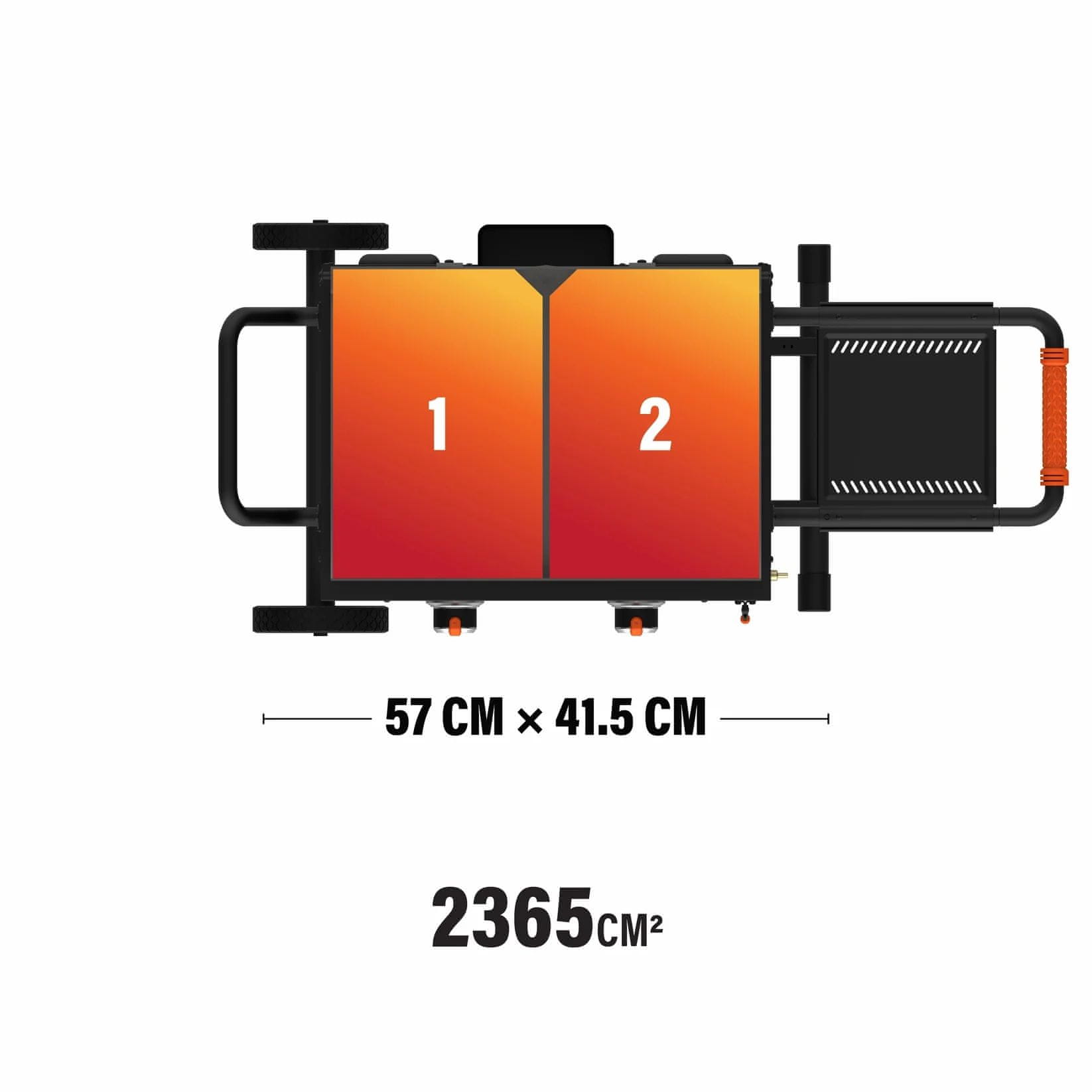 Vgrajen pokrov ščiti površino plošče in ohranja vse čisto med uporabo in med shranjevanjem. Ko jo peljete naokoli, varnostna zapora (latch) poskrbi, da pokrov ostane na mestu. Stranska polička doda prostor za pripravo in hkrati služi kot ročaj za lažje premikanje. Za shranjevanje je poskrbljeno tudi v pokončnem položaju, s praktičnim “kickstand” stojalom.