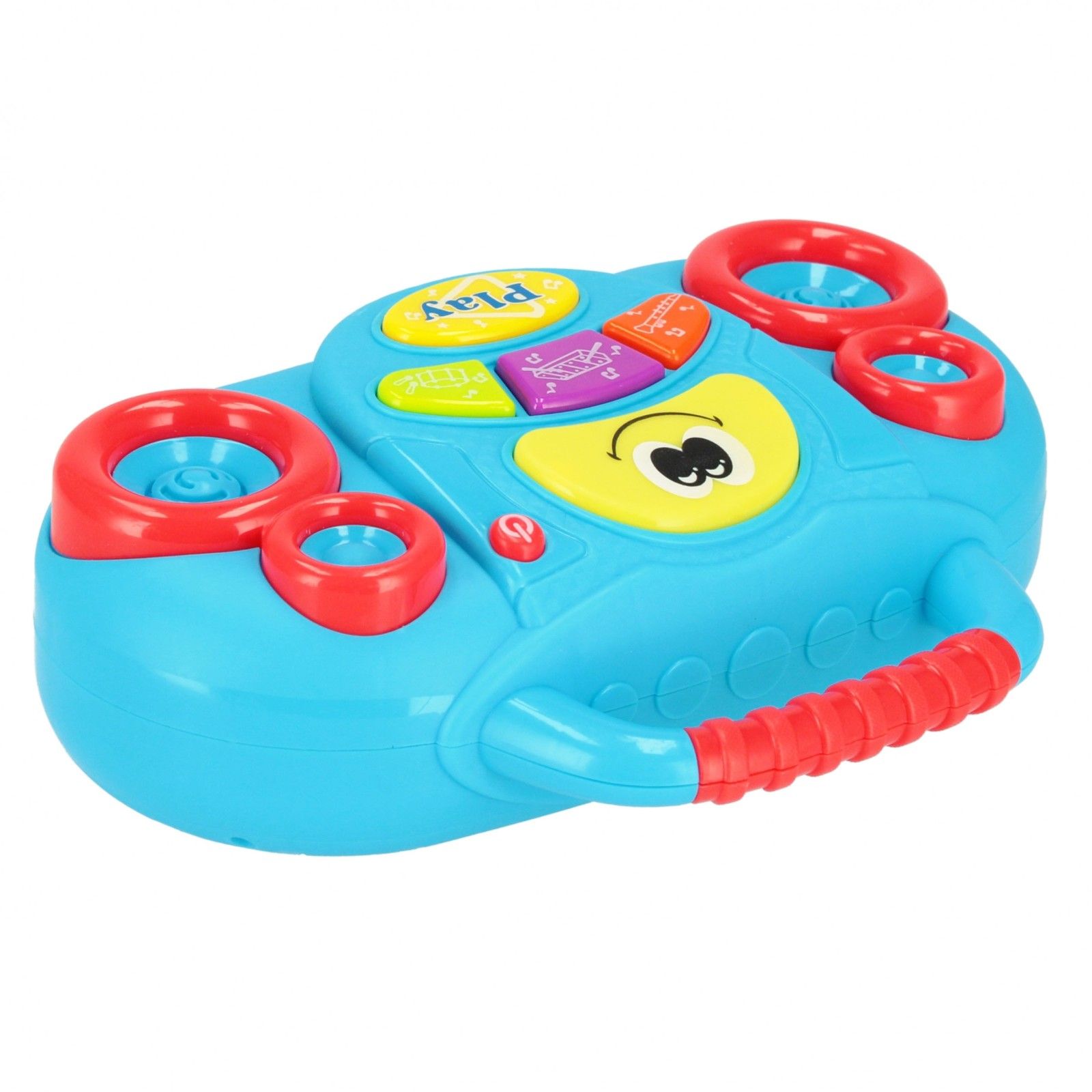 Radijski sprejemnik predvaja vesele melodije, ki malčke spodbujajo k aktivni igri in učenju s pomočjo zvoka.