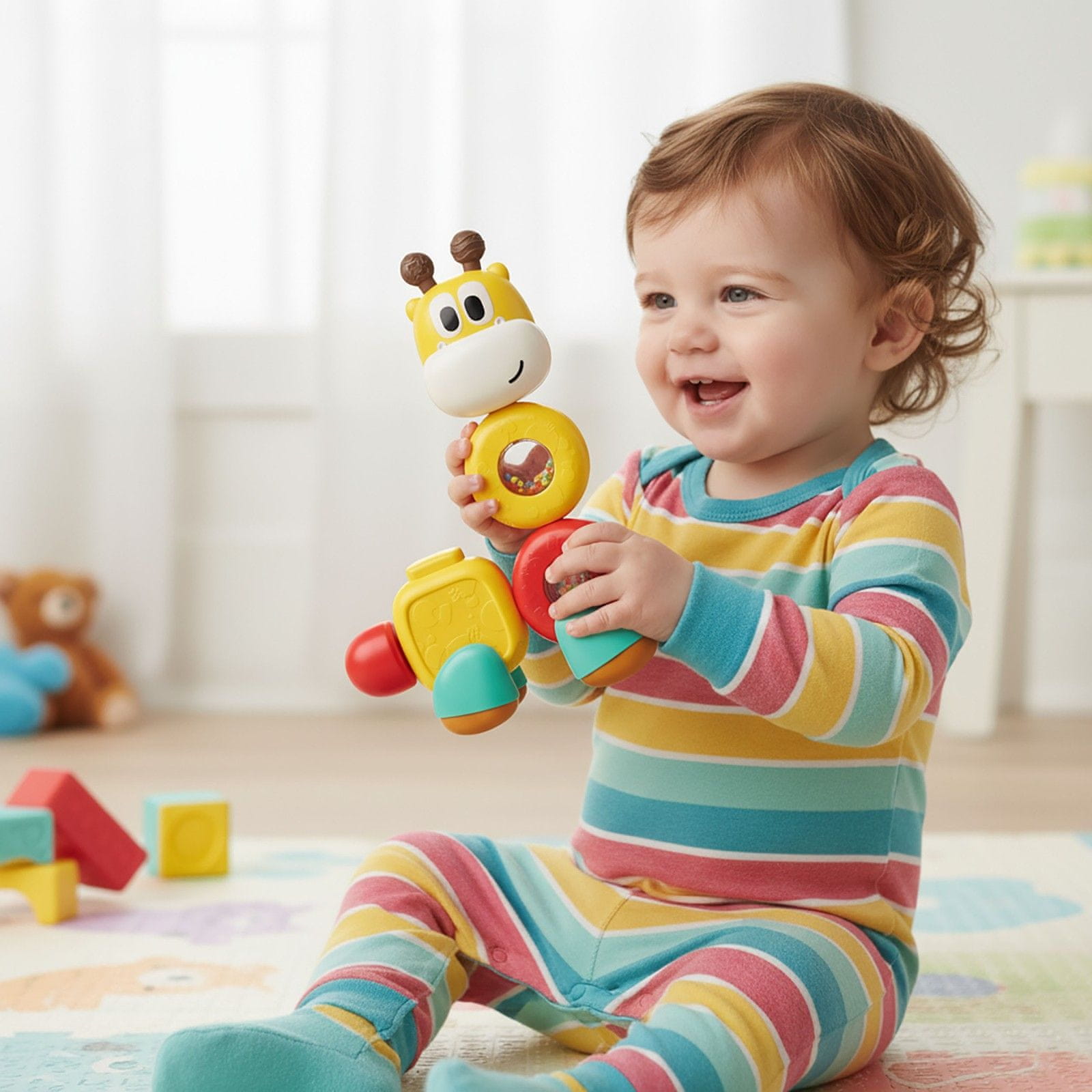 - Spodbuja ustvarjalnost in domišljijo – otrok lahko sam ustvari različne različice žirafe. – Spodbuja motorični razvoj in koordinacijo – prilagojen majhnim rokam. – Razvija logično razmišljanje in potrpežljivost – z združevanjem in zamenjavo delov. – Barvita, prijazna oblika – prit
