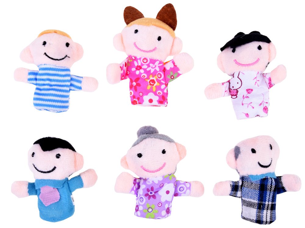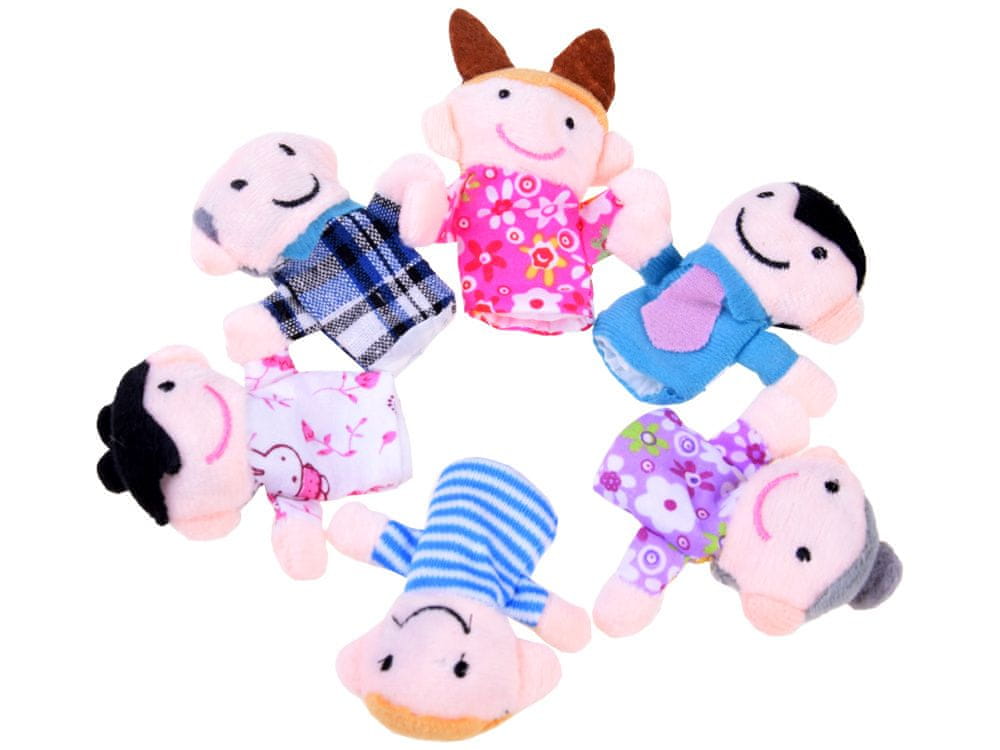 Mehke plišaste lutke babica, dedek, mama, oče, dva otroka na prste bodo zagotovile veliko zabave in razvile domišljijo našega otroka. Lutke so idealne za uprizarjanje različnih vrst prizorov in podoživljanje neštetih zgodb, ki lahko pomagajo popestriti zgodbo pred spanjem. Z njimi bomo zagotovo pritegnili najmlajše k igri gledališča.