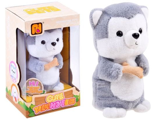Plišasti pes posluša, kaj mu govorite, in nato vse ponovi, pri tem pa veselo drgne s telesom. Ko maskoto vklopite, izgovorite besede, ki jih želite, da jih ponovi. Sivi pes je prijeten na dotik, veselo se drgne in spušča smešne zvoke.